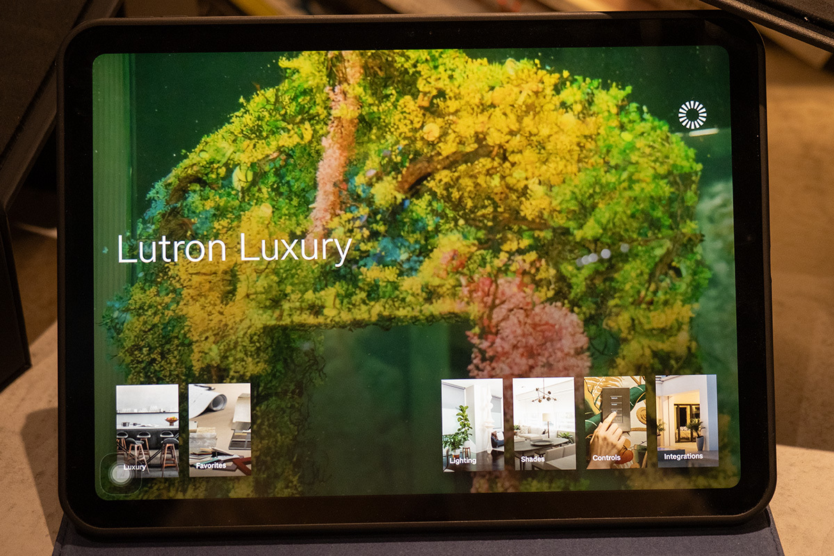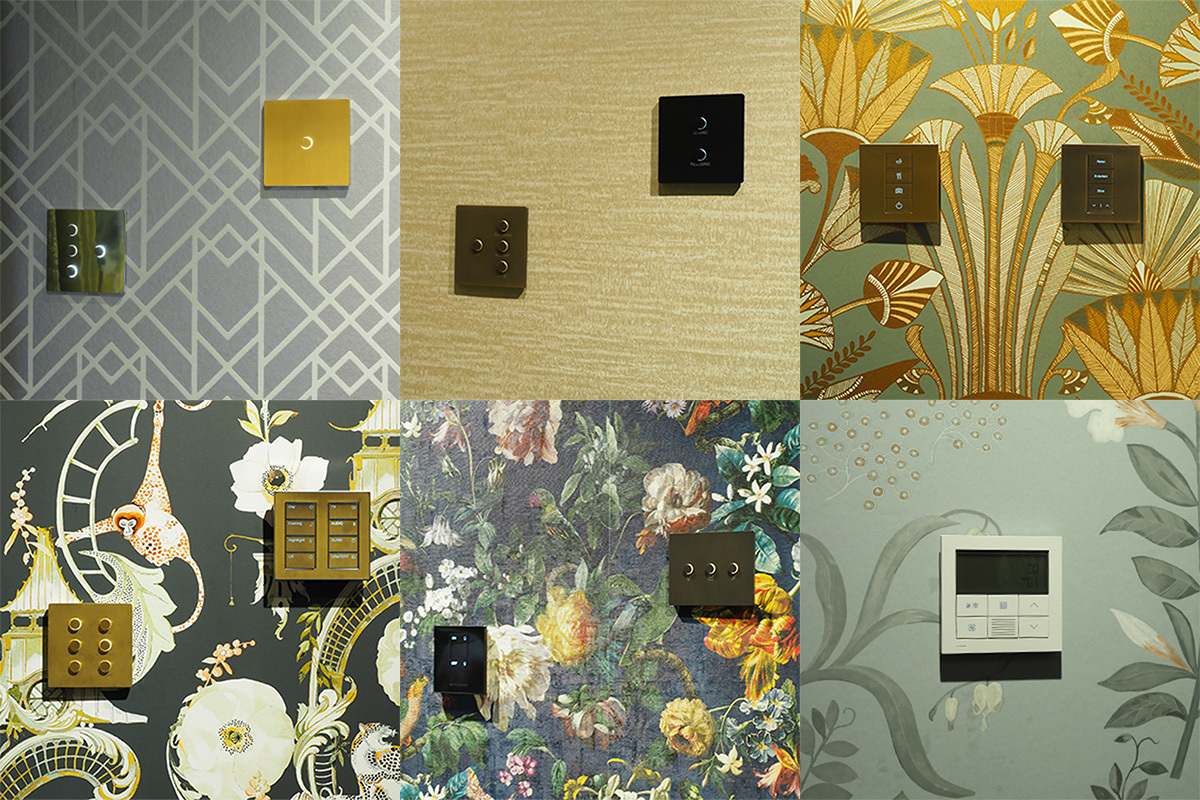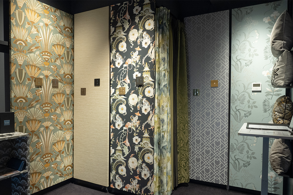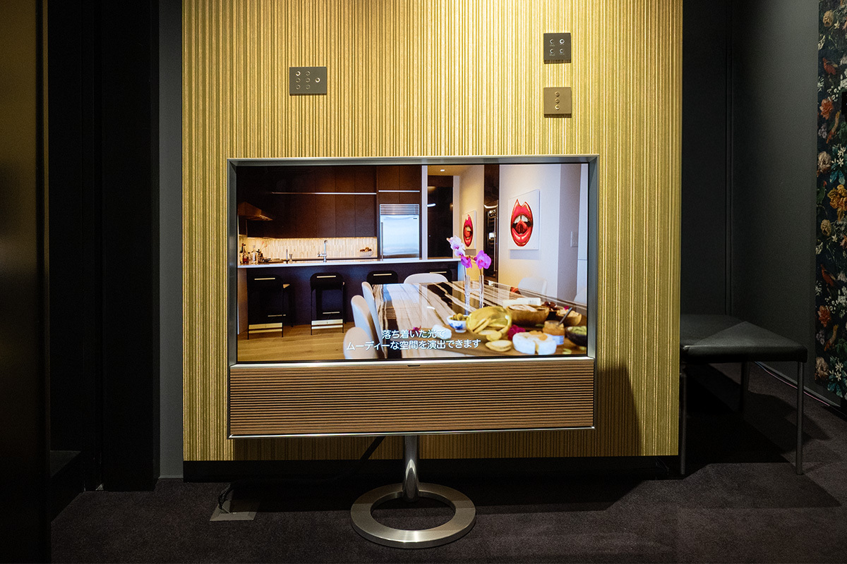 ほか、マナトレーディングのインテリアファブリックを採用した内装に、新製品「Alisse」をはじめとするルートロンのキーパッド、B&Oのホームシアターシステム「Beovision Contour」をコーディネートした展示も。