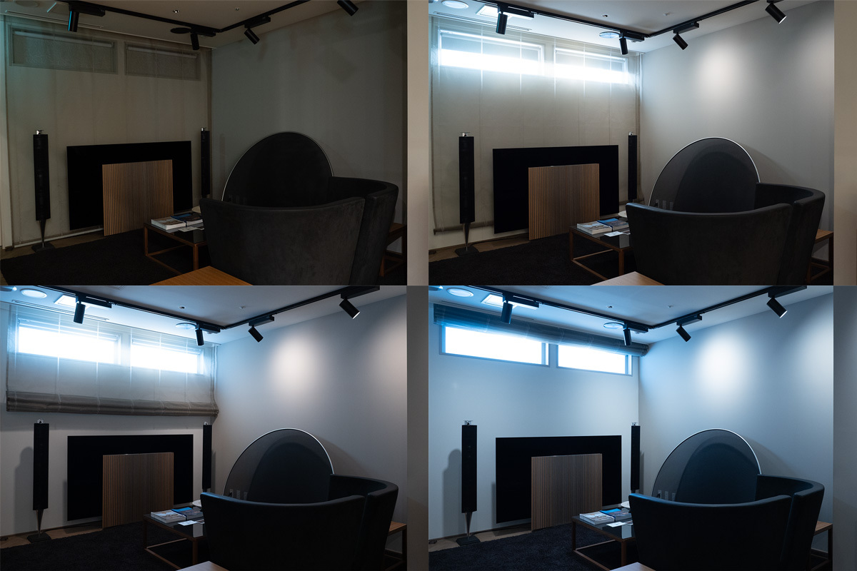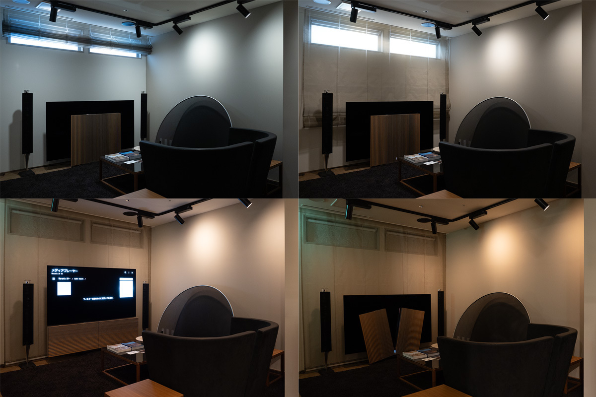 Beolab 90 Alchemy Editionは97型の4K有機ELテレビが一体になった「Beovision Harmony」と組み合わせて展示。部屋の照明、カーテン、シェード、ホームシアターシステムはオートメーションされており、キーパッドを1回押すだけでシチュエーションを切り替えできる