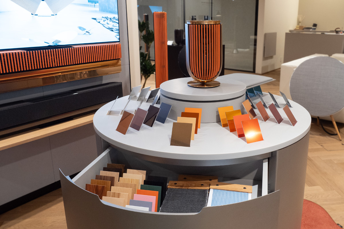 B&Oのスピーカーは新サービス「Atelierカタログ」によって、カラーや素材、仕上げなどをカスタマイズした5種類の「Beolab 28」を揃える。カーテンに合わせたカスタマイズとなっており、通常モデルとのテイストの違いが体感できた。