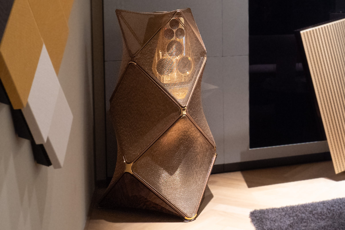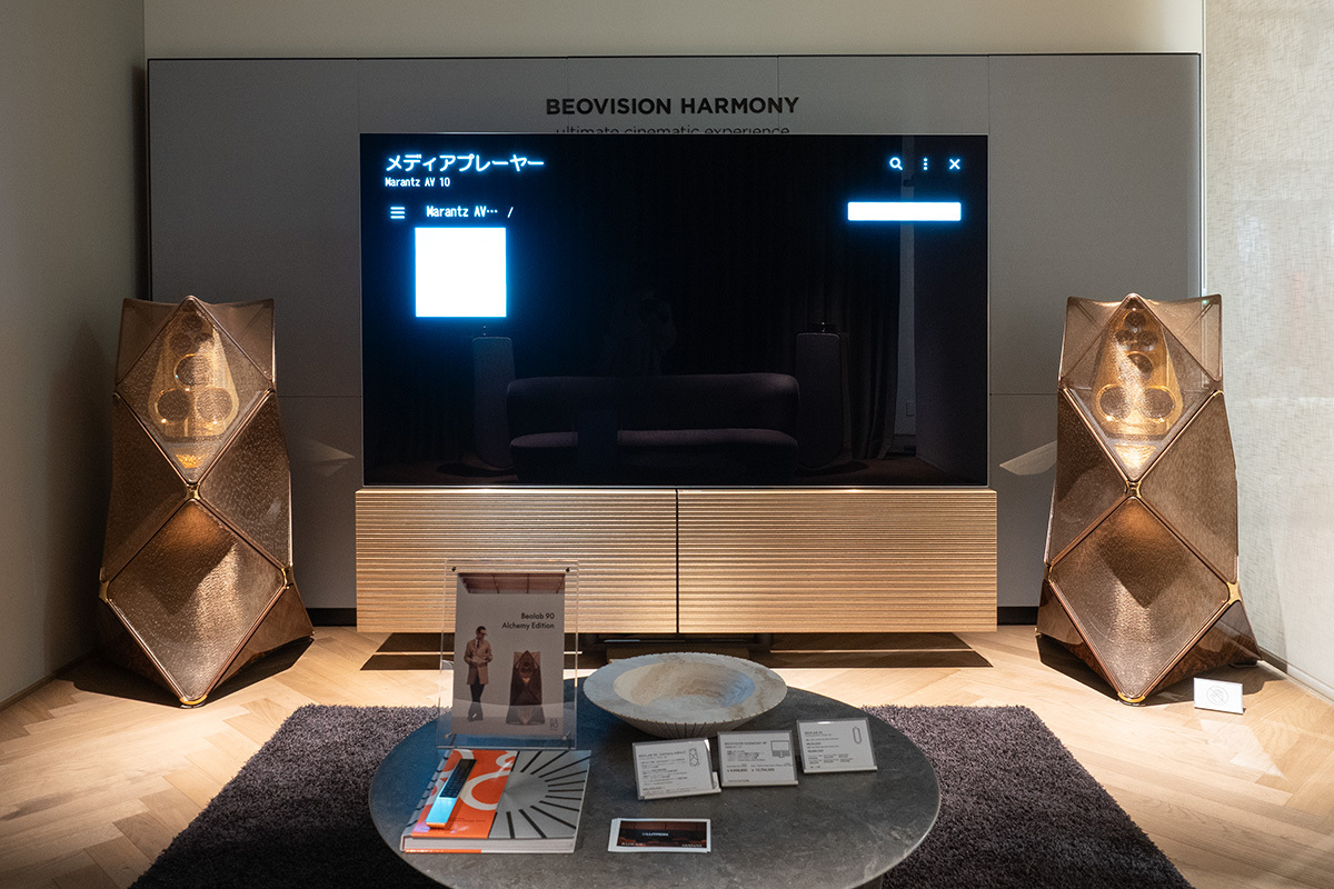 B&O六本木店ではブランド100周年記念モデルも展示。フルオーダーメイドの「Atelierビスポーク」の開始に伴い発表された、世界50ペア限定のスピーカーシステム「Beolab 90 Alchemy Edition」は、24Kのフロント・トップ・サイドカバー、ブロンズメッシュのスピーカーカバー、ウォールナットのパネルを採用している。