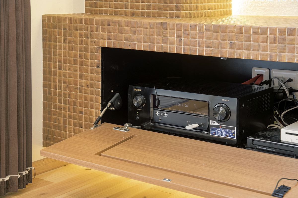 美しい佇まいから想像できるとおり、妥協は一切ない。節が特徴的な無垢の杉材を採用したフローリング、左官で仕上げた壁、木目調のモザイクタイルが貼られたオリジナルの壁面収納家具、ウォールナットの一枚板を天板に採用したテーブルなど、細部までこだわりが詰まっている。ホームシアターの機器はそんな住まいと美しく調和するようにプランニングされた。