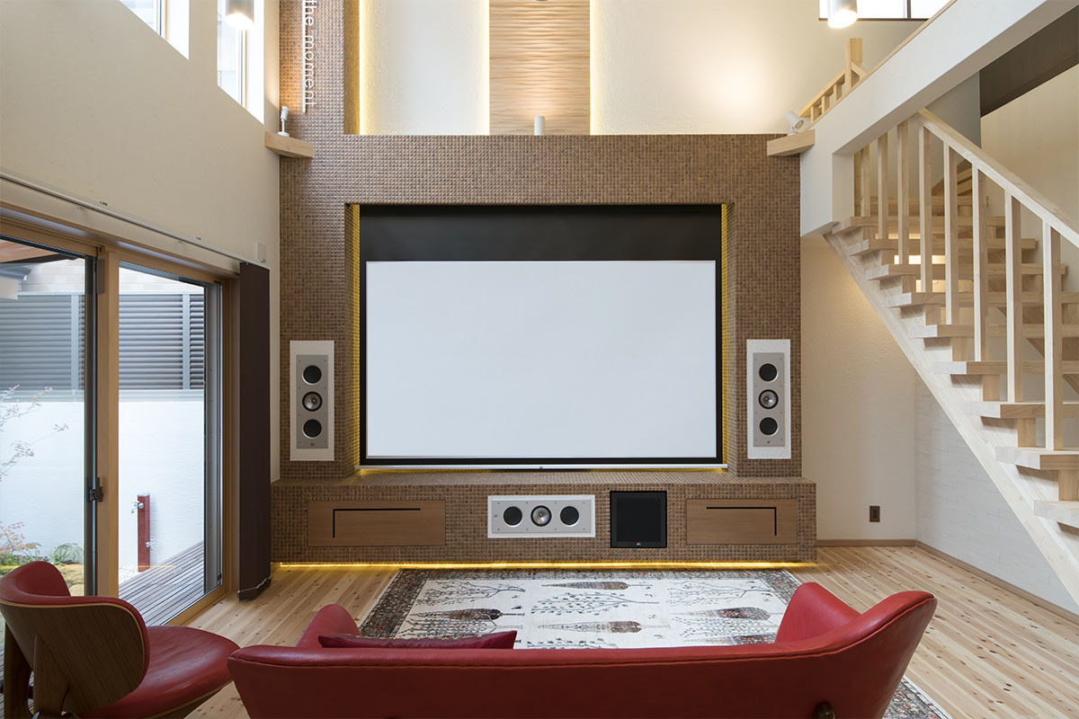木のぬくもりあふれるモダンなリビングに設えられた、誰もが羨むような美しいホームシアターだ。「リビングを家族が集まる空間にしたい。どうしたら家族みんなが楽しめるか考えてきた時に浮かんできたのがホームシアターでした」と、オーナーのKさんはホームシアターをはじめたきっかけを語る。