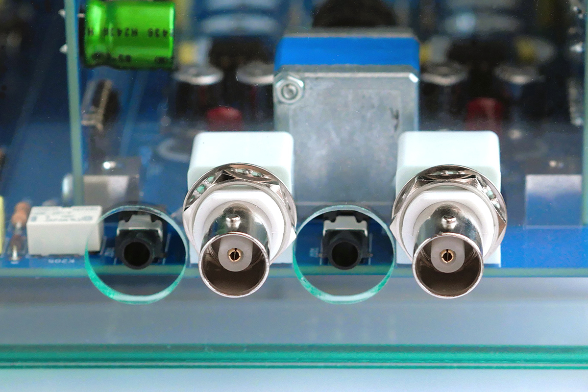 音声入力は3.5mmミニジャックのほか、BNC端子を備える。「一般的なRCAピンプラグとしなかった理由はなに?」と思い吉田さんに尋ねてみると、「今回の製品はキットでの提供ですのでとくにオーディオの好きなアナログ回路技術者を対象にしています。超低ひずみの性能をもっておりますが、その性能をアナログ回路技術者が測定して確かめるにはオーディオ計測器に使用されている BNCが最適と考えました。また今後ユーザー自身がこれを超えるモジュールを開発するかもしれません。その際に測定に便利なようにしております」とのこと。あくまで開発者を念頭においての採用だったことがわかる。