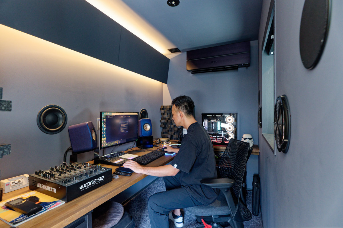 2階に上がると、より三宅さんのやりたいことが見えてくる。そのひとつが、マニアックな男のお籠もり部屋DTMスタジオ&ゲーミングルームだ。35dBの防音室で、狭小空間ながらPCとソフトウェアを使った制御された低音を体験できる。