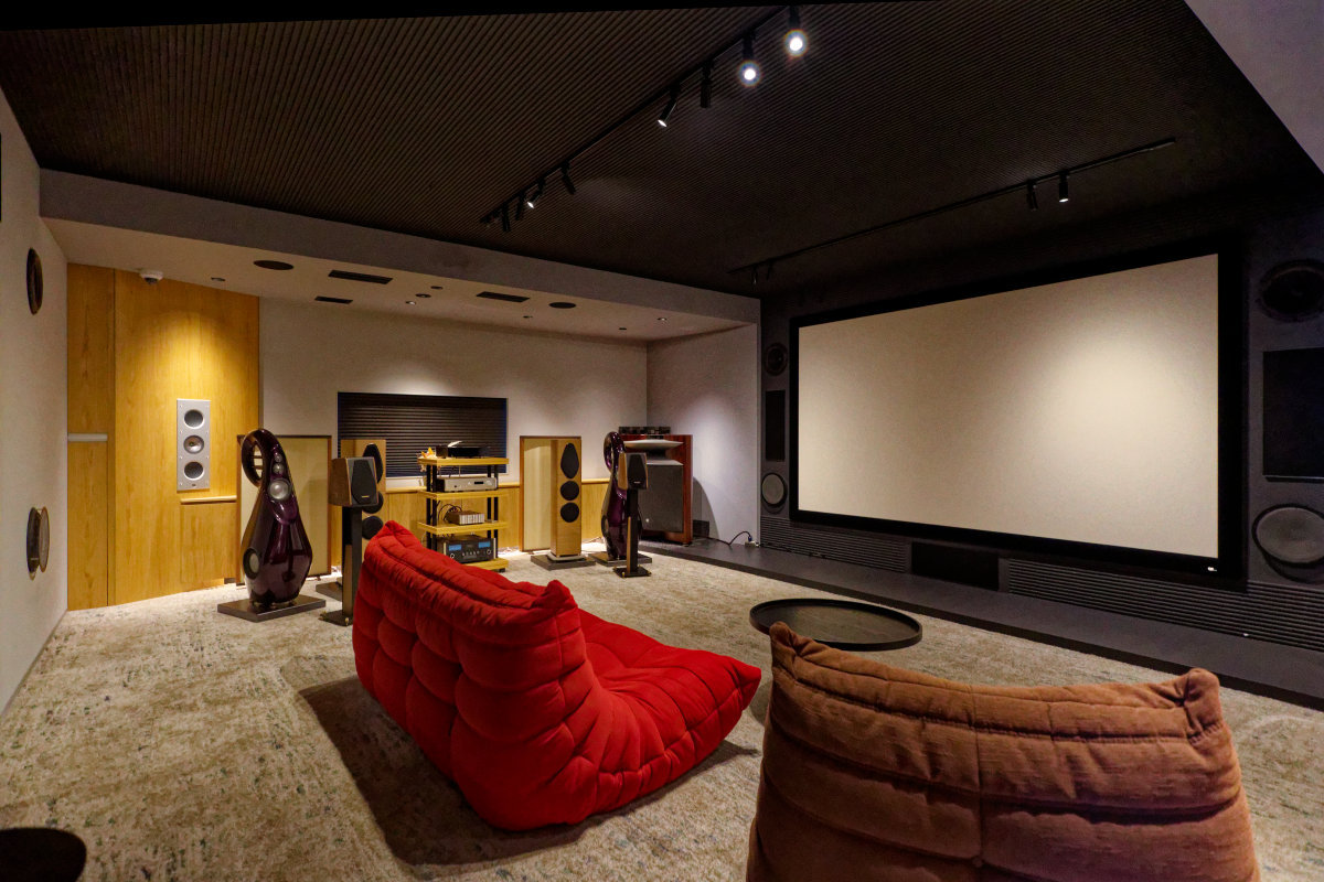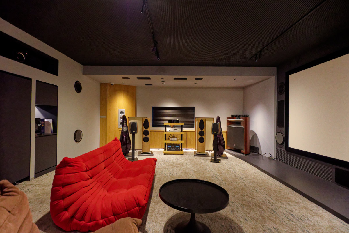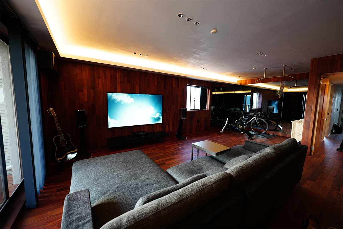 サラウンド構成としては5.1.4ch、横長配置の広々とした豪邸仕様のリビングシアターだ。縦長に使って、オーディオイベント会場としても使用される。