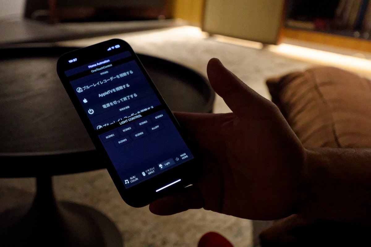 110型スクリーンを核とした5.1chシアター。同じ部屋に、部屋を横長にしてソファをゆったり使った2.1chのテレビシアターも共存している。この部屋はちょっとしたホームオートメーションの体験ルームでもあり、照明や電動シャッターと連動している。