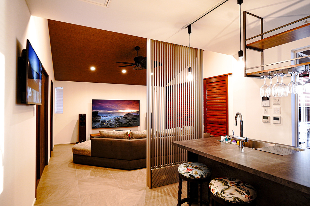 「あの部屋は、まず一杯飲みながらゆったり寛げる共感や交流が生まれるLOUNGEという位置づけです。そのあとシアタールームで集中して映画や音楽の映像作品を堪能していただこうというイメージなんです」