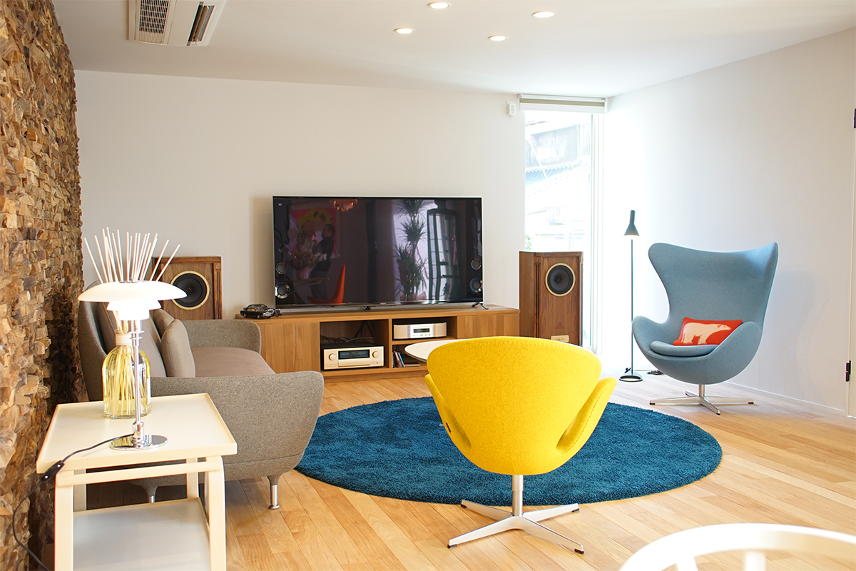新築住宅のリビングを寄りすぐりの家具とオーディオシステムをきれいに融合