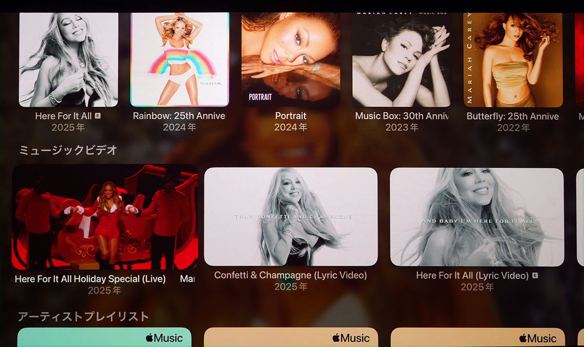 そこでUHD8000で『Mariah Carey's Here for It All Holiday Special』を再生してみたところ、Apple TV 4Kとは印象の異なる映像が再現された。マライア・キャリーの衣装の朱色がやや抑えめで、きらびやかさが若干抑えた印象になる。