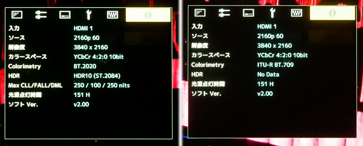 DLA-V900Rで映像情報を確認すると、4K/SDRとして出力されている。Apple TV 4Kが2K/SDRを4K/HDRに変換していたのに対し、UHD8000は解像度は4K変換しているが、SDRはオリジナルのままで出力しているということだ。