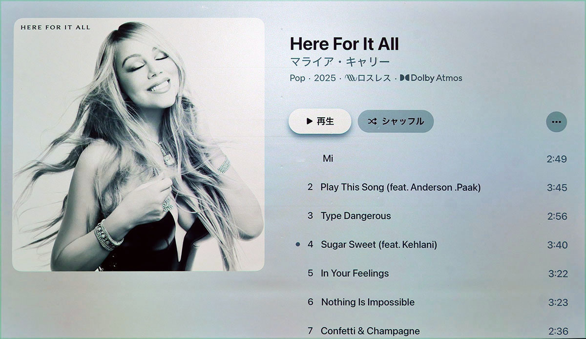 今回の『Mariah Carey's Here for It All Holiday Special』は、ひじょうにていねいに制作されたコンテンツで、再生環境を整えることで色々な楽しみができる品質を持っている。Apple Musicではこのライブをアーカイブコンテンツとして配信しているので、ぜひご自分のシステムで楽しんでいただきたい。