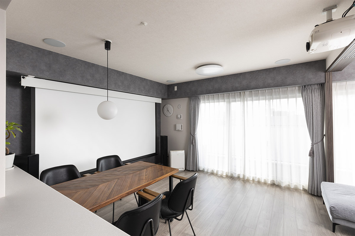 HOMETHEATER DATA ●住宅形態:マンション/リフォーム ●ホームシアターの広さ:7畳 ●画面サイズ:100型 ●サラウンド:5.1.6ch ●インストール内容:機器設置、システムプランニング など