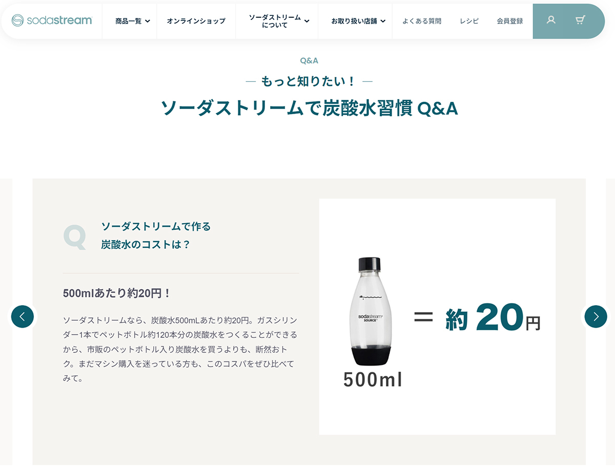 そこで炭酸水メーカーの導入案が浮上した。ペットボトルのゴミが出ないし、早起きしなくて済む。それに炭酸水メーカーで作った方が安上がりになるというのだ。HPによると500mLのペットボトルで約20円と、市販の強炭酸水の約1/5の価格でできるというではないか。これを買わない理由はない。
