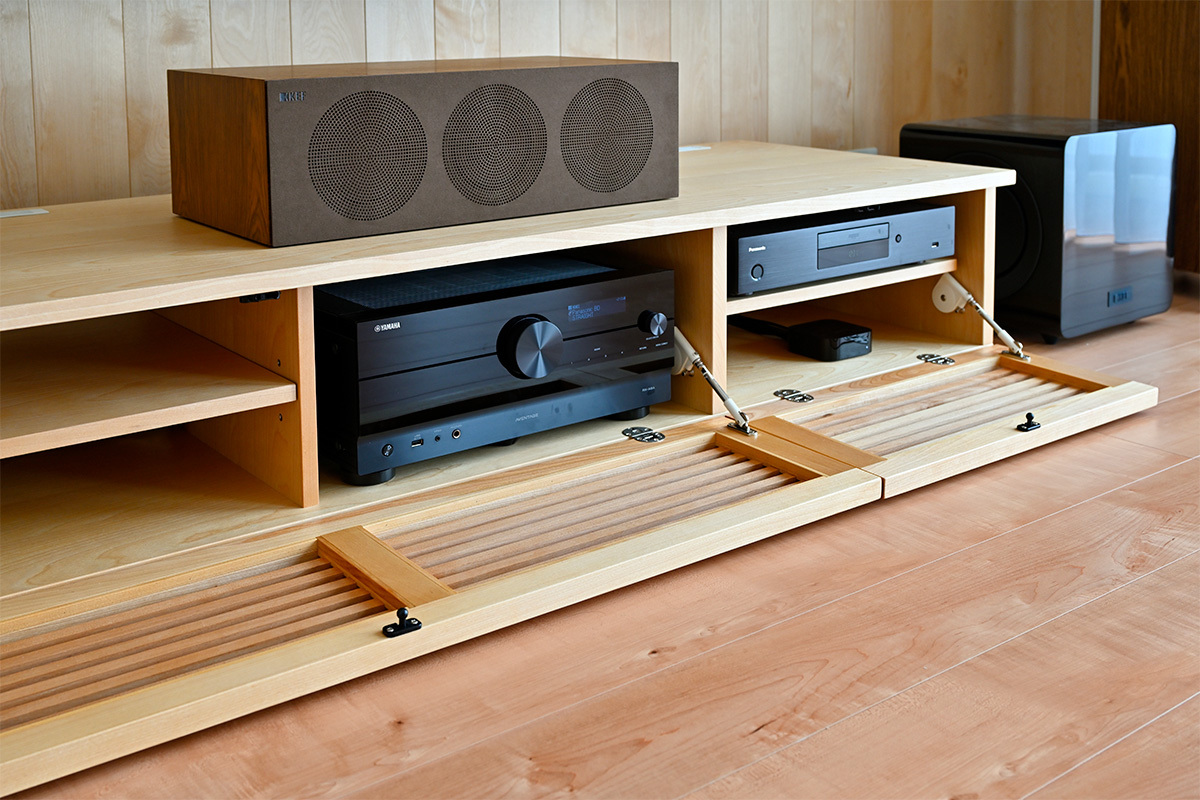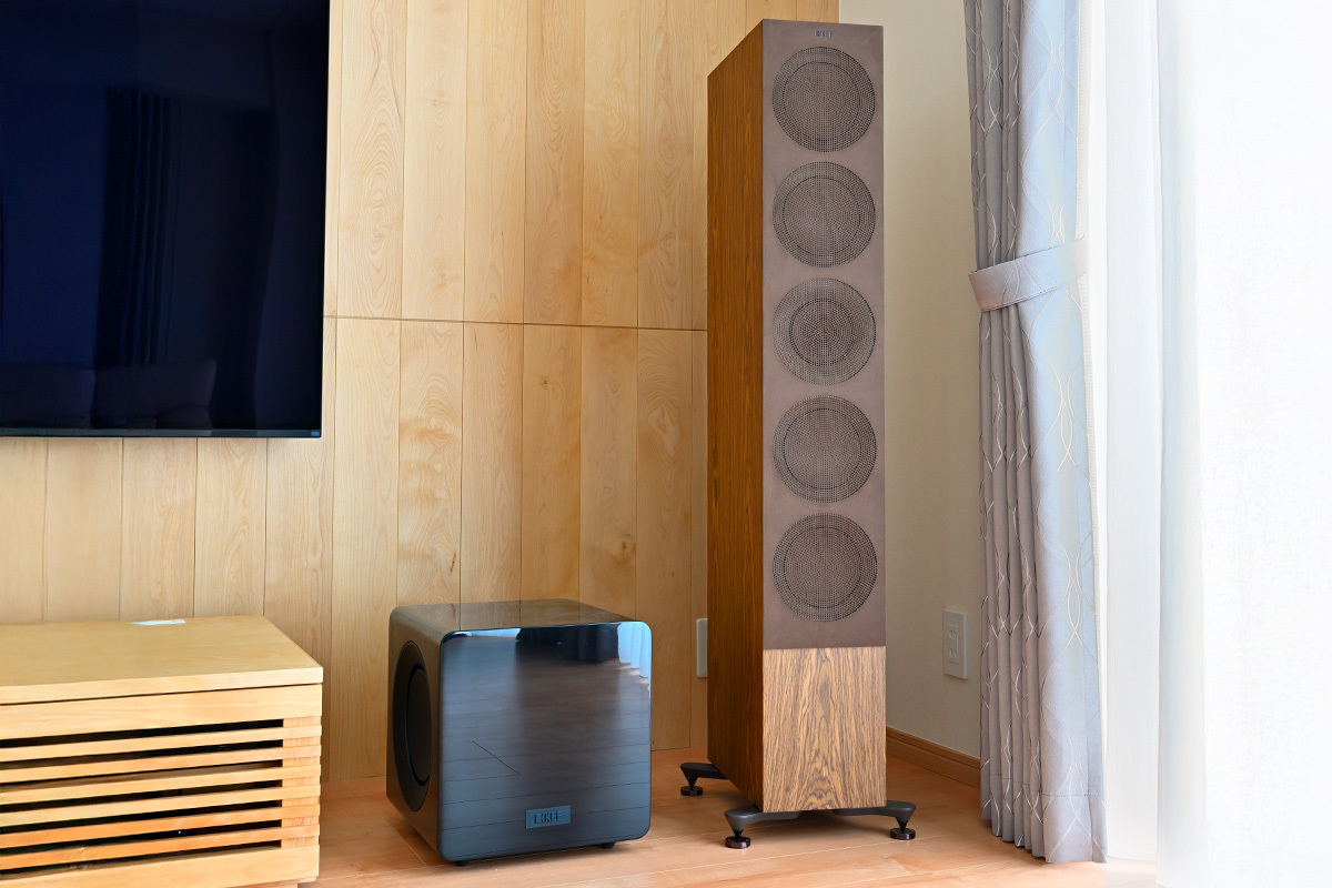 フロントおよびセンタースピーカーは「床のメープル色にマッチするデザインのものがほしい」というIさんの要望に合わせて、KEF「Rシリーズ」のウォールナットをチョイス。元々英国ブランドのスピーカーのサウンドを好んでいたIさんに、諏訪氏がお薦めし、試聴を繰り返した末にRシリーズに至ったのだという。