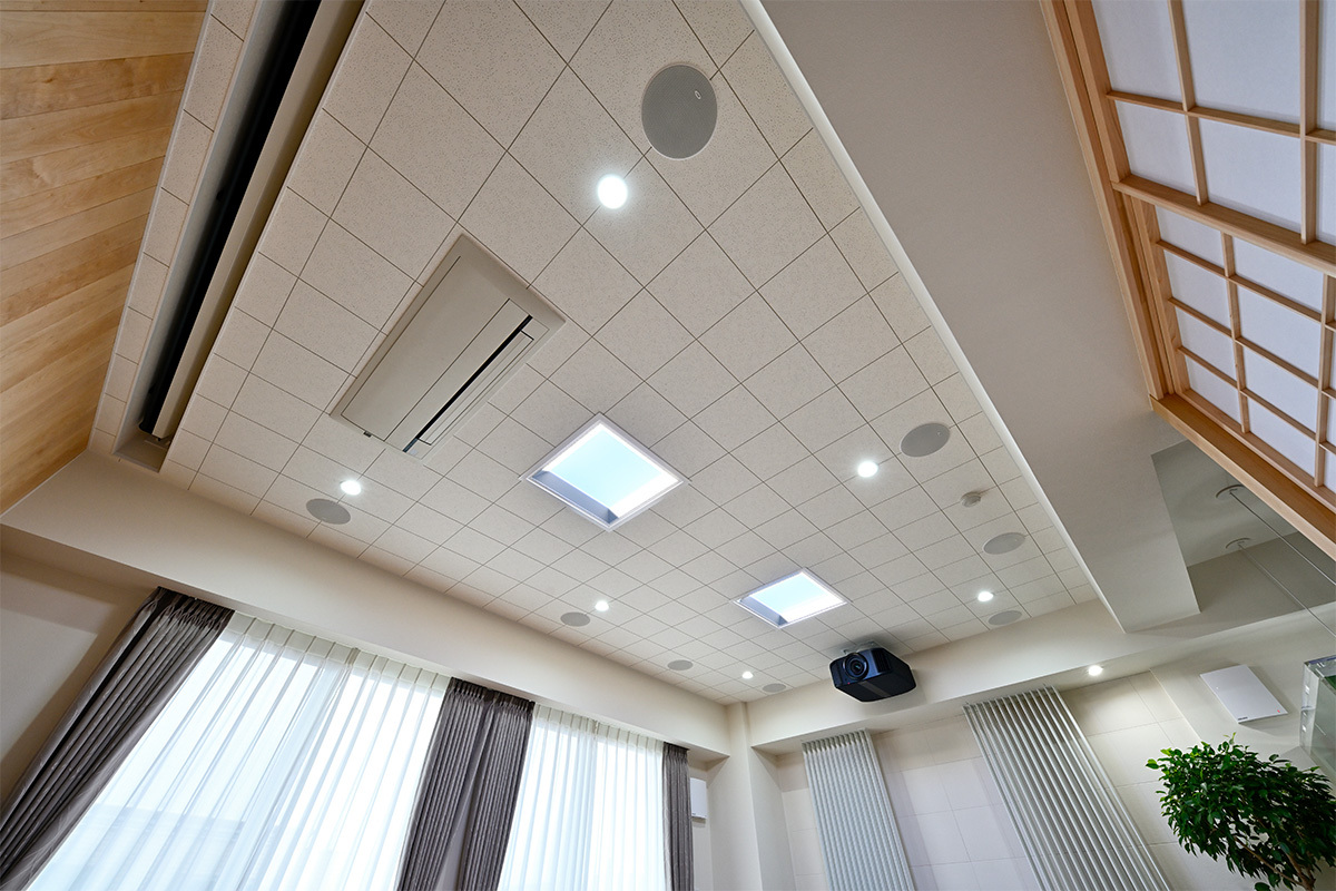 サラウンドとトップスピーカーには埋め込みタイプを選ぶことで、すっきりとした美観を損ねずに、Dolby Atmosの再生にも対応する7.2.4chを構築している。さらに、埋め込みスピーカーはダウンライトの位置に合わせてシンメトリーに配置するなど、細部まで徹底的にこだわっている。まさにプロの技だ。