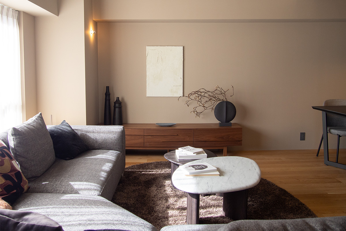 「G1は仕事や家事で忙しい方に向けた癒しの住まい、その中でリビングは『いるだけで心地よい空間』になるようにデザインしています。自然な雰囲気づくりのため、大きな面積を占める壁は塗料の質感が残るようデザインがほどこされています」と、壁の素材にもこだわりがあるという。