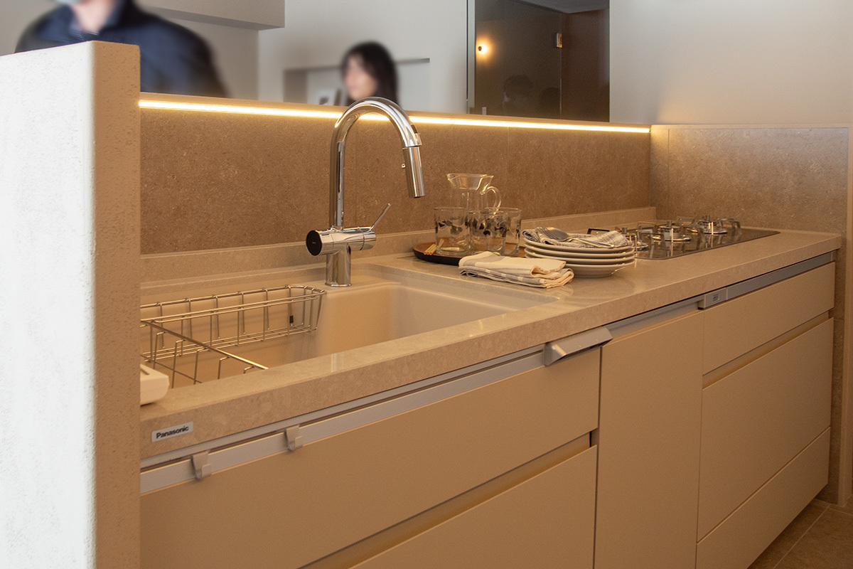 対して、ダイニング/キッチンは家の中でもっとも会話が生まれる場所として設計。生活感を感じさせず、視覚的なノイズを軽減させるデザインとなっている。自動水栓、大容量でフロントオープンの食洗機、使いやすく掃除しやすい3口横並びのコンロなど、家事の負担を軽減する設備/機器を備える。