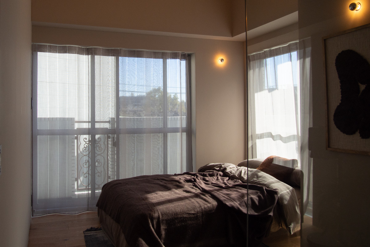 「今回、照明計画の一環で天井にダクトレールを設置していないので、吊り下げタイプのプロジェクターは設置できません。『HORIZON 20 Max』はスタンドを使ってフロアライトのように設置でき、家具っぽく馴染んで、動線を邪魔しない点が魅力でした。本体のデザインも、レザー調っぽいマットな質感がグレージュの空間によく合いますよね」と、設置性とデザイン性において、親和性の高さを教えてくれた。