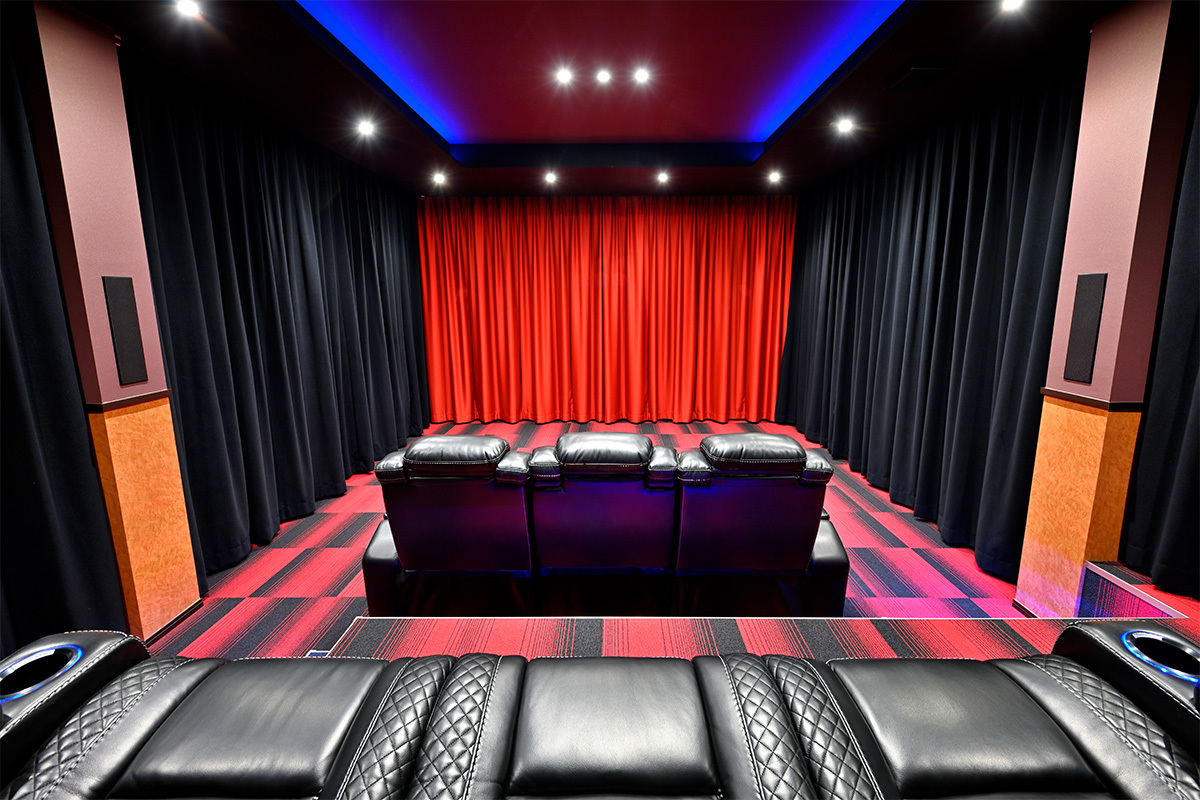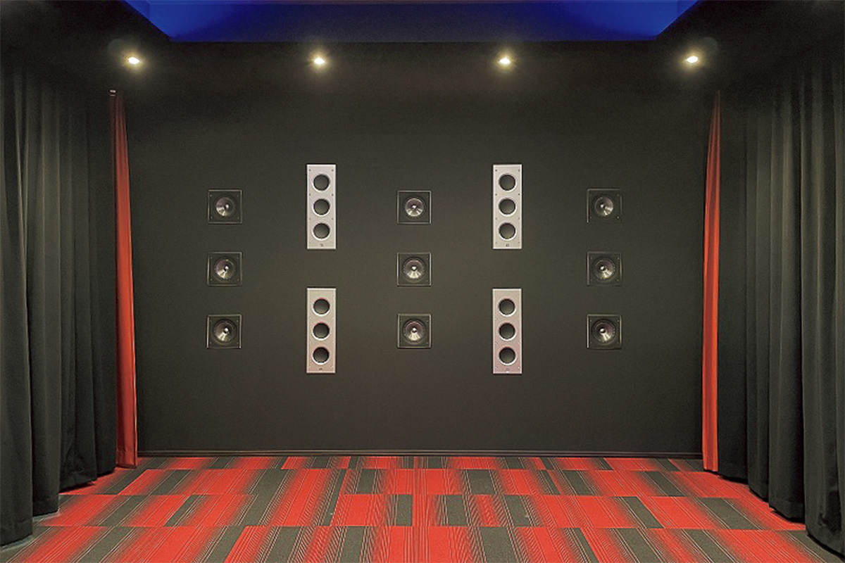 完成した空間は一見して「映画館」とわかるほど、非常に完成度が高い。壁一面に張り込まれたスクリーンは180型。劇場と同じサウンドスクリーン仕様とし、その裏側にはTHX認証のKEFの埋め込みスピーカーがずらりと並ぶ。