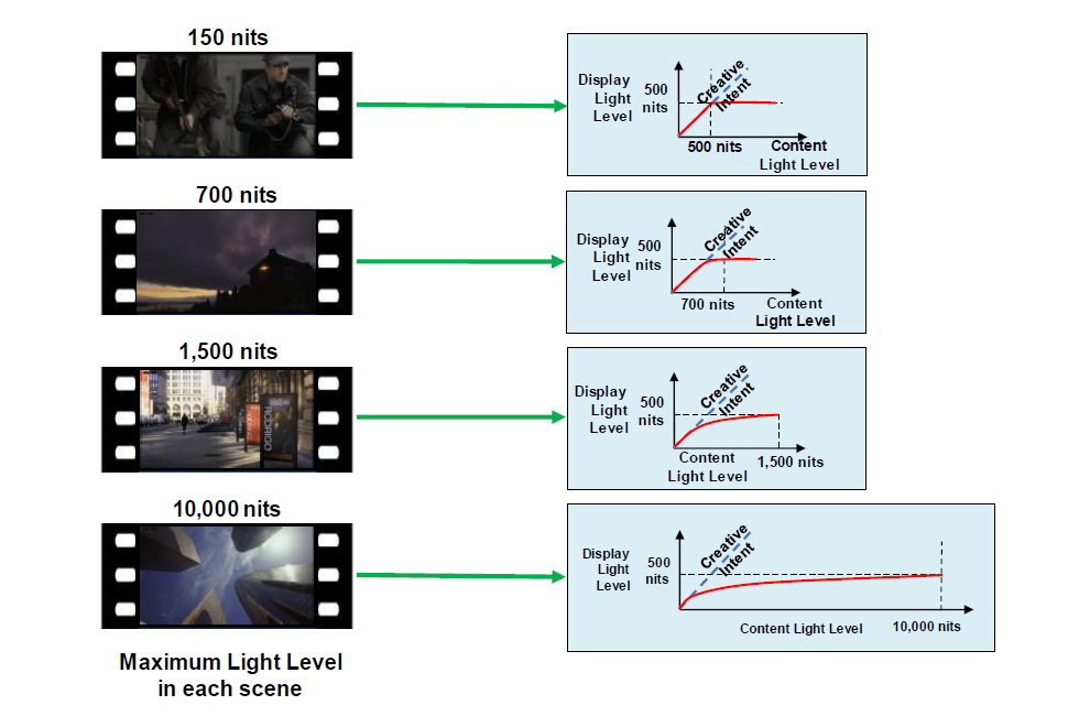 メタデータが付いているため、テレビをはじめとする映像機器は、あらかじみコンテンツの輝度情報を得ることができるため、情報を受け取った映像機器の輝度表示性能に合わせて、階調の再配置の「トーンマッピング」を行うことが可能だ。