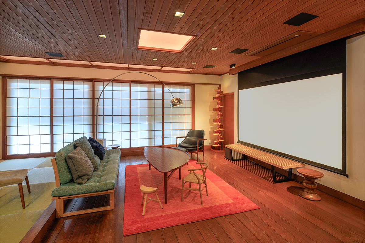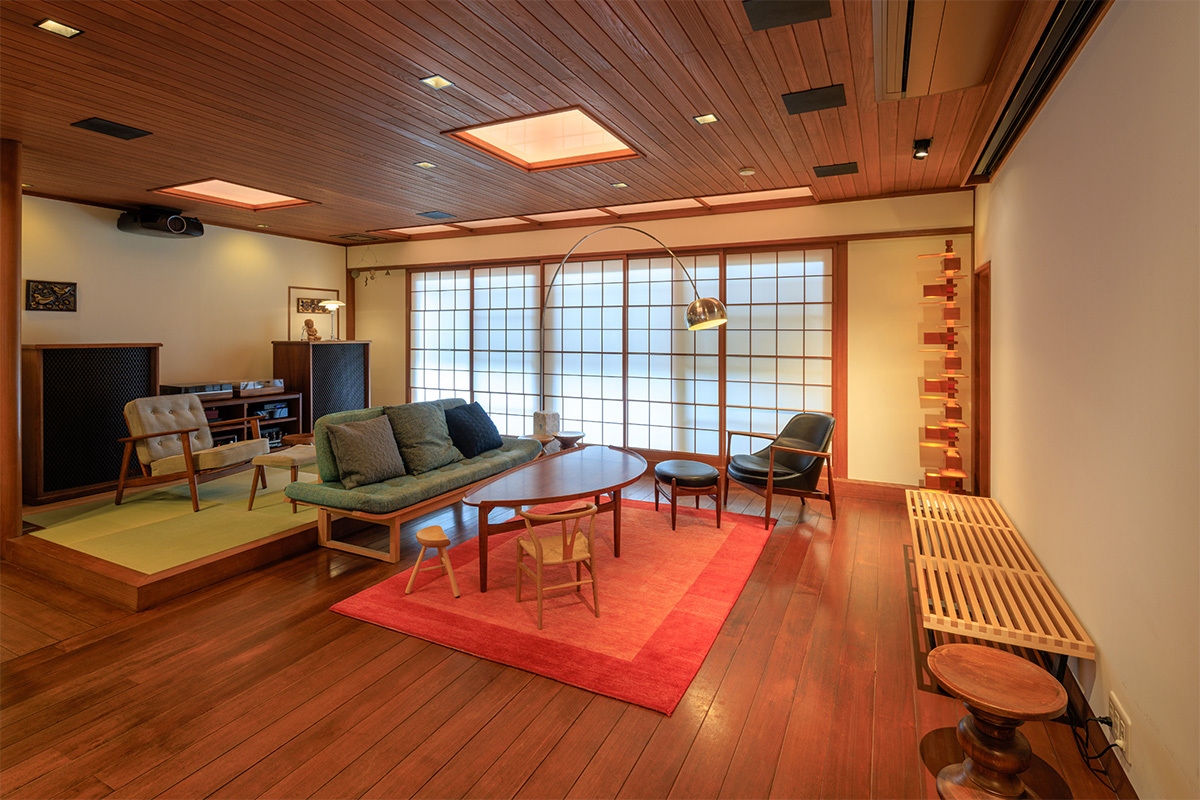 木材の風合い豊かな和風建築。ゆったりとしたLDKは、キッズサイズのチェアがならぶ家族の空間だ。そんなLDKのリビングにあって、なお美しく調和するホームシアターは、Nさん一家の暮らしに合わせてさまざまに姿を変える。
