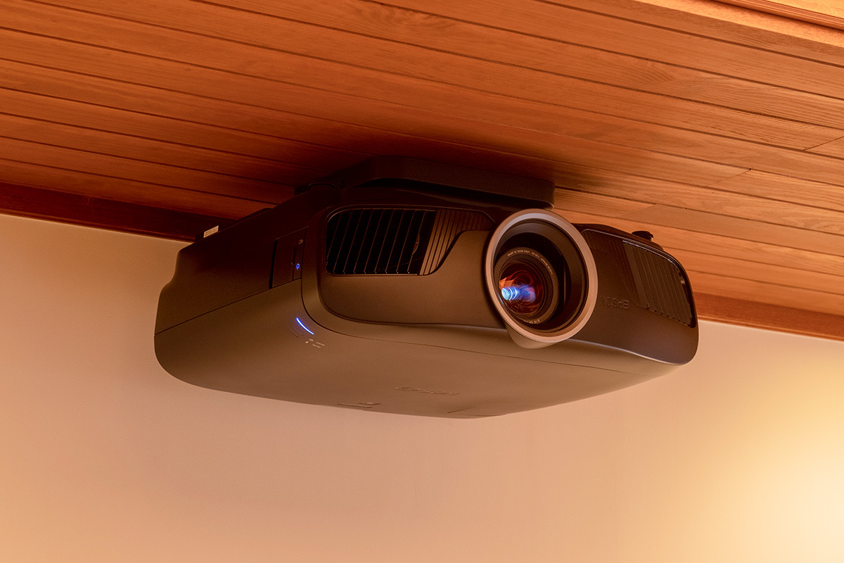プロジェクターはリビングで明るく色鮮やかな描写を保ち、また設置性に優れたエプソンの4Kモデルを採用した。