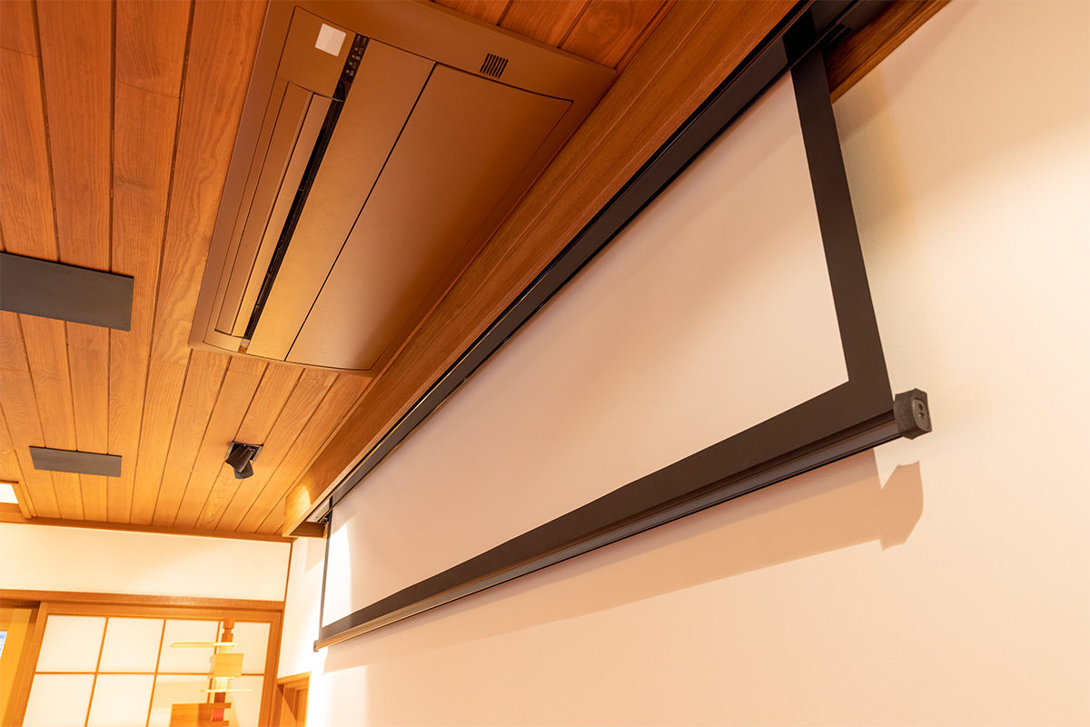 スクリーンは、リビングとダイニングのゆるやかなゾーニングに収まりつつ、家族がソファ付近に集まって観賞もできる110型をピックアップ。幕面は外光の影響を受けにくいキクチのビーズ系スクリーンを採用し、明るい鮮明な映像と広い視野角を両立する。