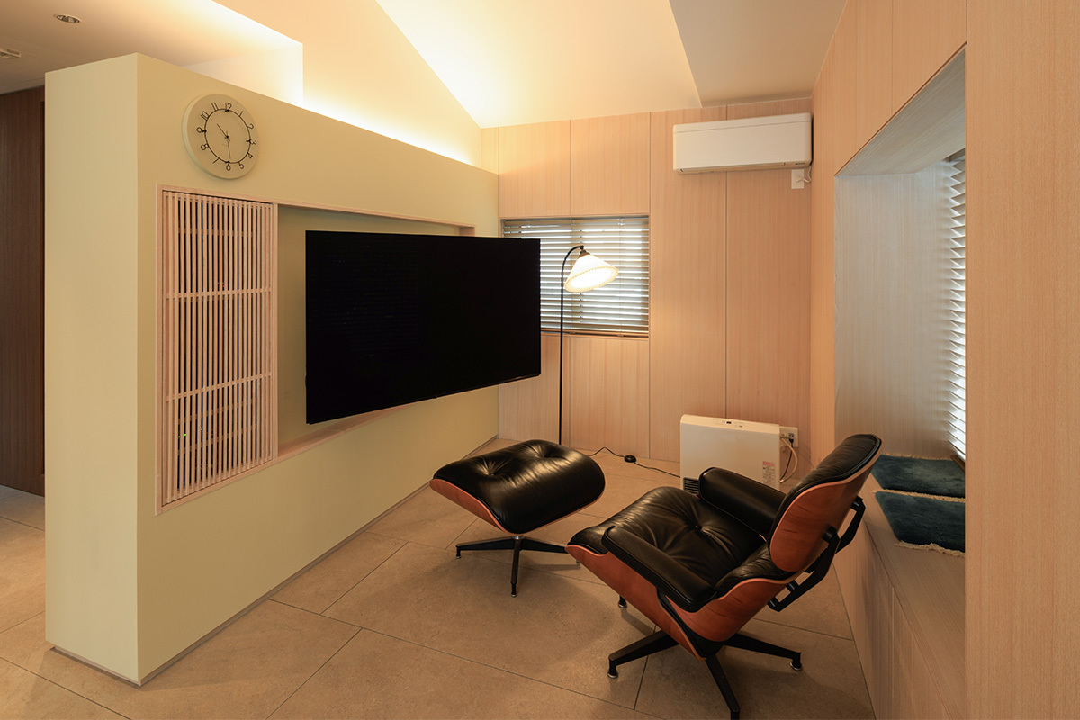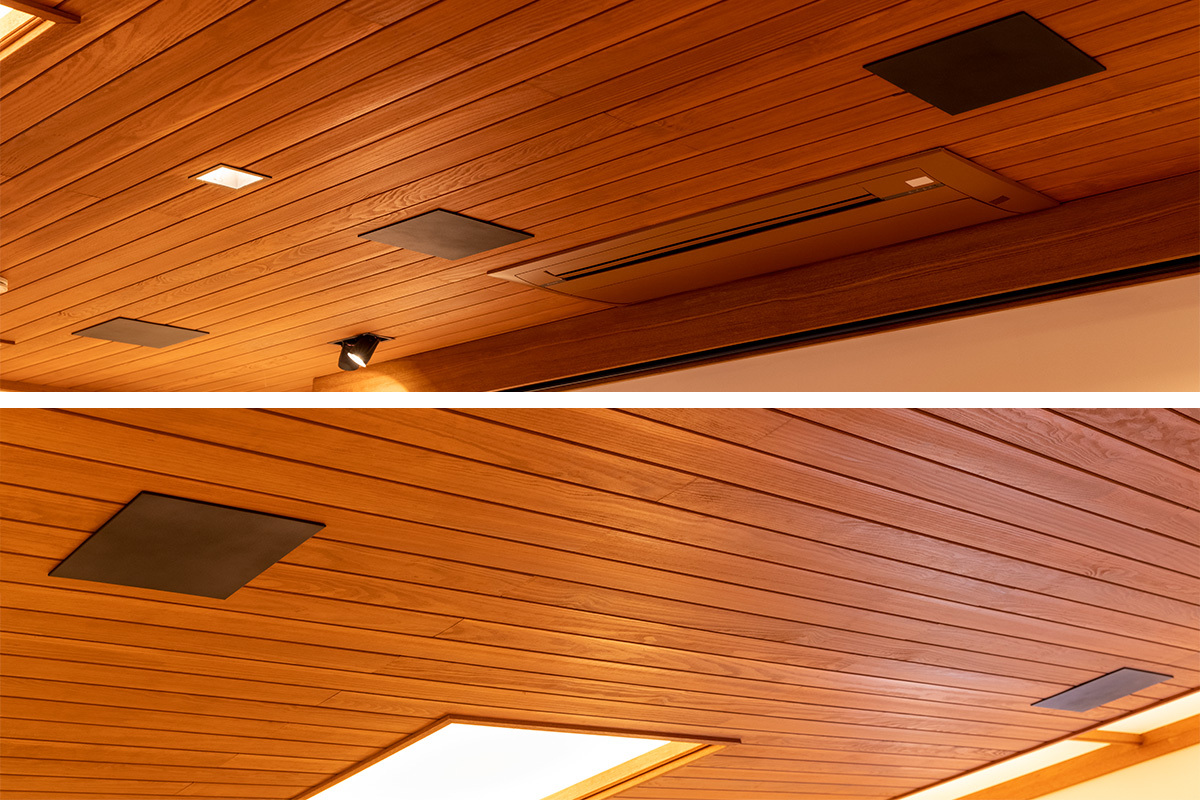 加えて、生活動線との両立を考慮し、サブウーファー以外のスピーカーは、床置きを避けて埋め込みタイプに。天井開口や配管の埋設、配線の隠蔽など建築作業は、上掲のスクリーンボックスと同じく、建築の設計・施工を担当した亀匠が行っているため、見た目にもすっきり。