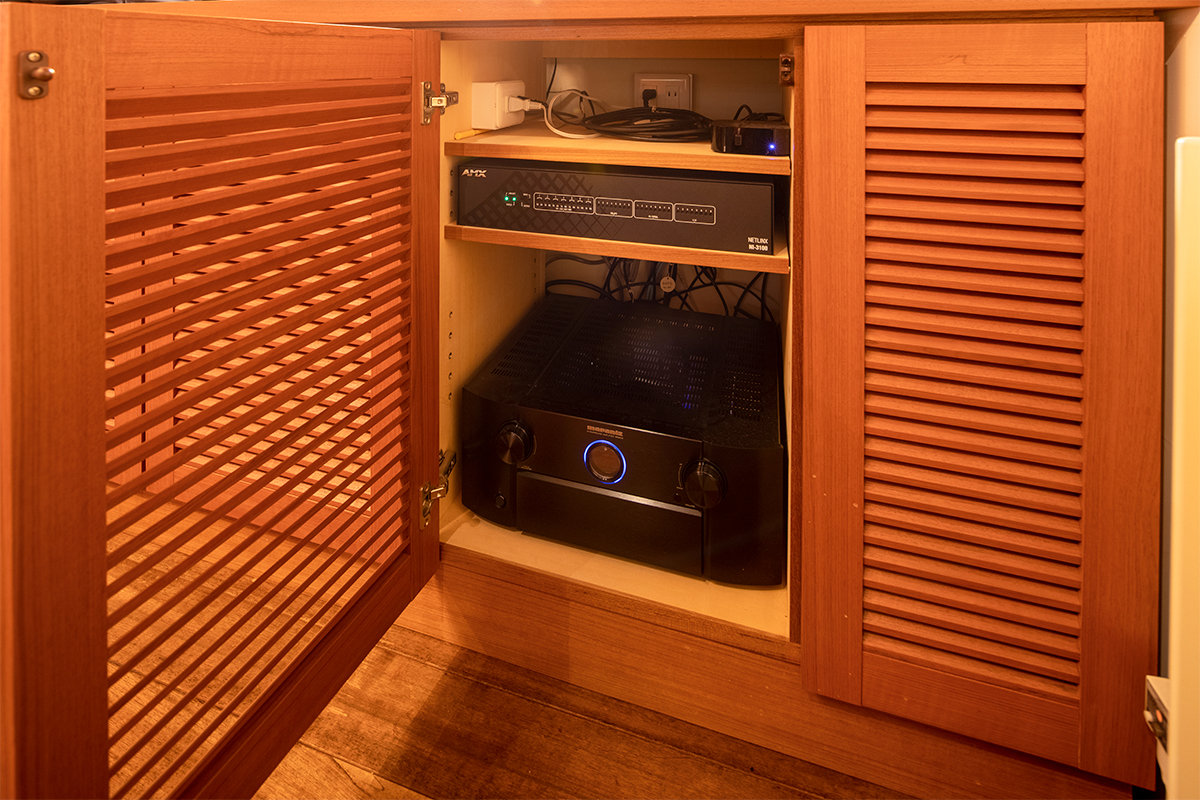 AVアンプやブルーレイレコーダーなどの関連機器は、ダイニングの家具に収納。オートメーションでiPadにコントロールを一括化しているため、機器本体は視聴位置から離れていても使い勝手に障りはない。