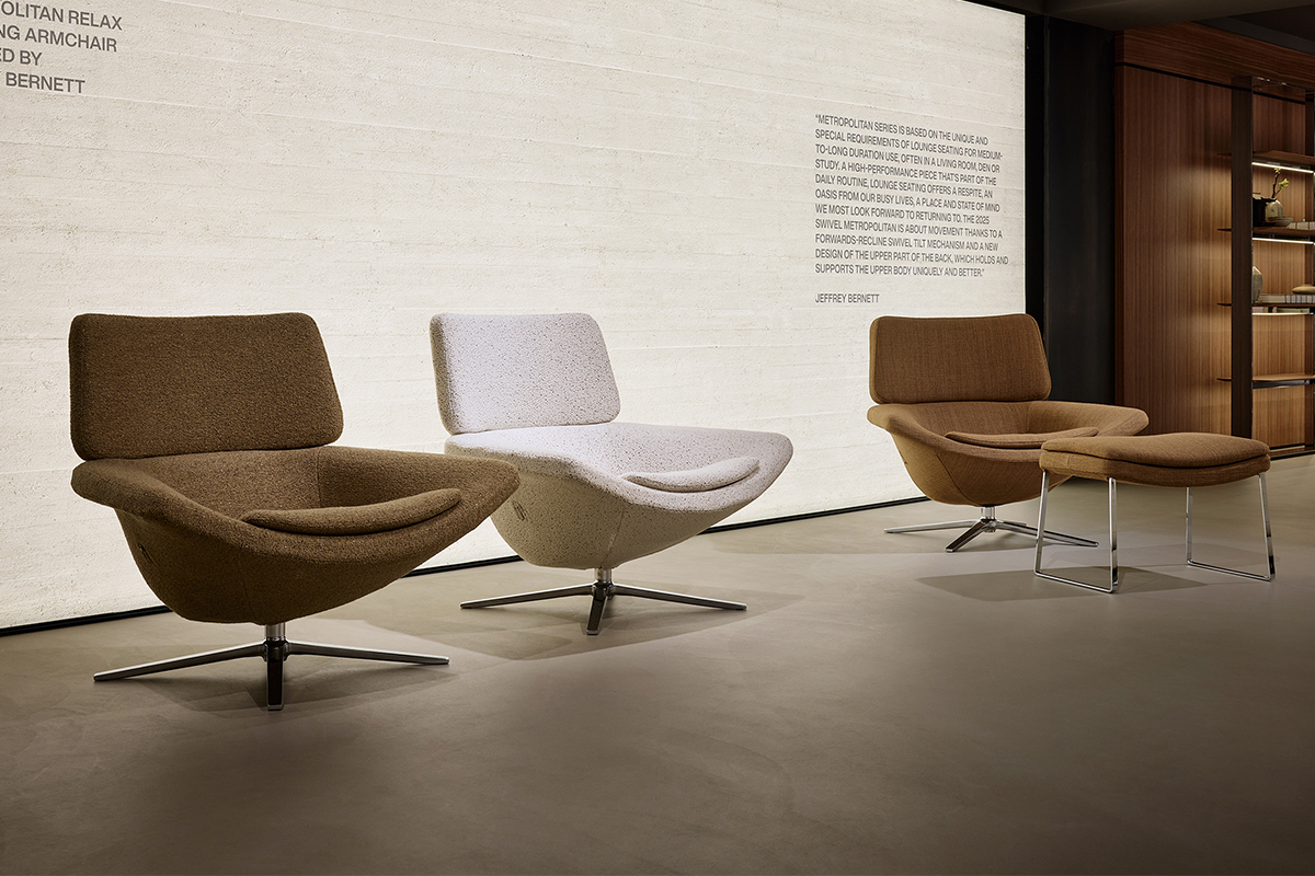 目玉となる新作は、アントニオ・チッテリオによる柔らかく包み込んでくれるようなシーティングシステム「Cocùn(コクーン)」と、ジェフリー・バーネットによる人間工学に基づくロッキングおよび回転機能を備えたラウンジチェア「Metropolitan Relax(メトロポリタン リラックス)」。