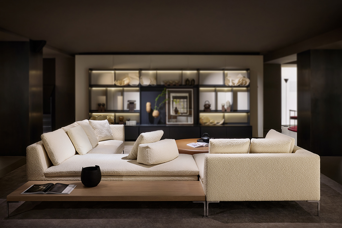 今回追加されたのは、ベンチやデイベッド、木製のローテーブルとコンソール。これらが加わるだけで核となるCharlesへの多様なアクセスと、それによる新たな活用法が生まれ、リビングソファとしての適応力の高さを再確認させてくれる。