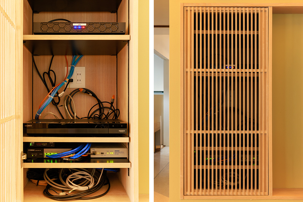 中古物件の1階をリフォームしたN邸。入居から十数年、水回りの整備や2階のスケルトンリノベーションなど、家族のライフスタイルに合わせて、段階的にこつこつ家づくりを行なっている。水回りの整備で2回目の工事を行う際、リビングにホームシアターをしつらえたことをきっかけに、松崎氏がネットワーク関連の設備も整えることとなった。