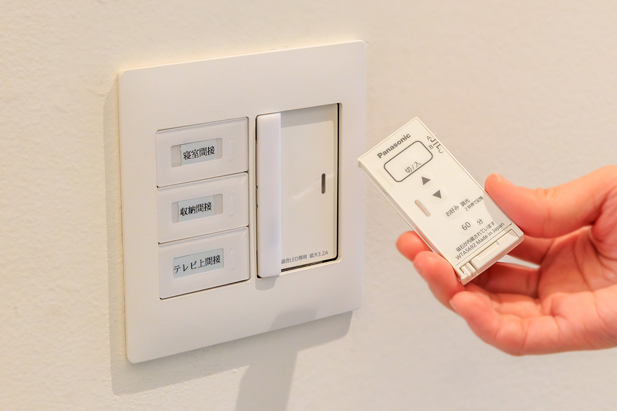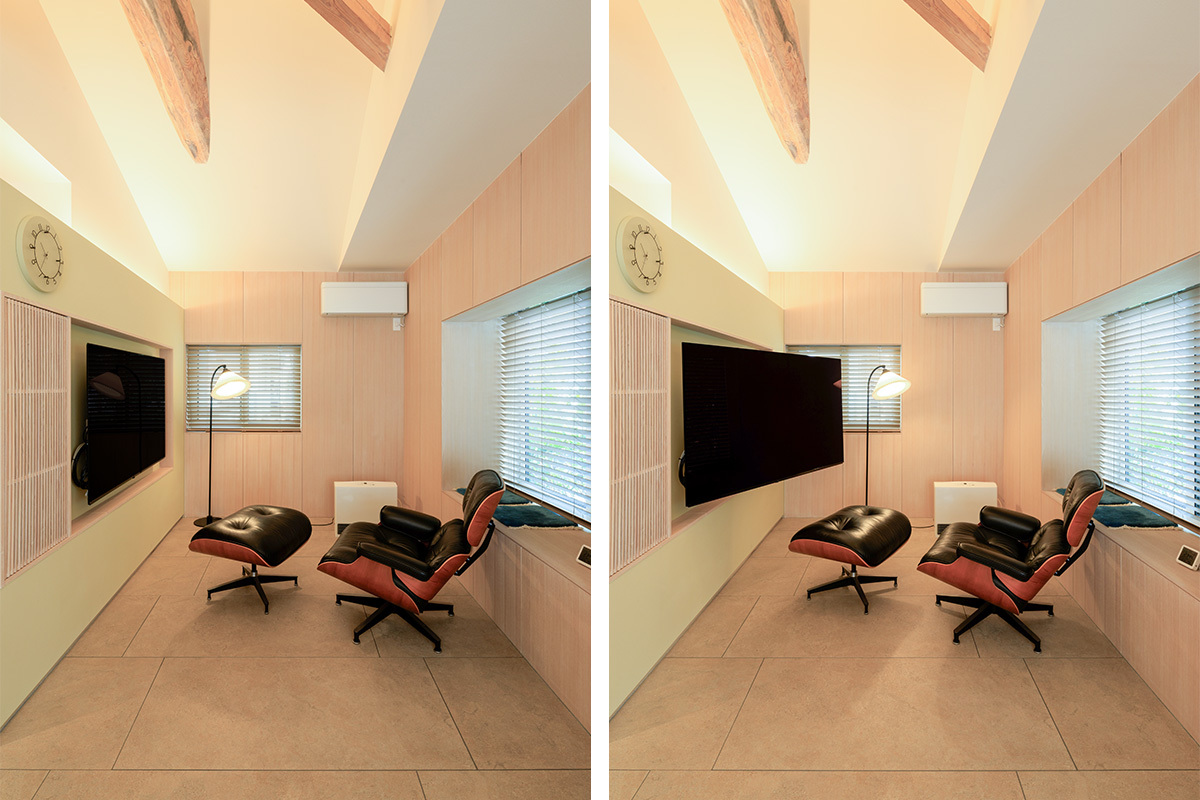 普段はお子さんがNintendo Switchを遊んだり、学校行事のビデオ映像を見たり、プライベートなリラックス空間。一方、家族の外出時にはタイマー制御によって、適正音量への調整を含むテレビの自動運転を開始。照明の自動点灯とあわせて、家の中で人が生活している様子を装うことができる。