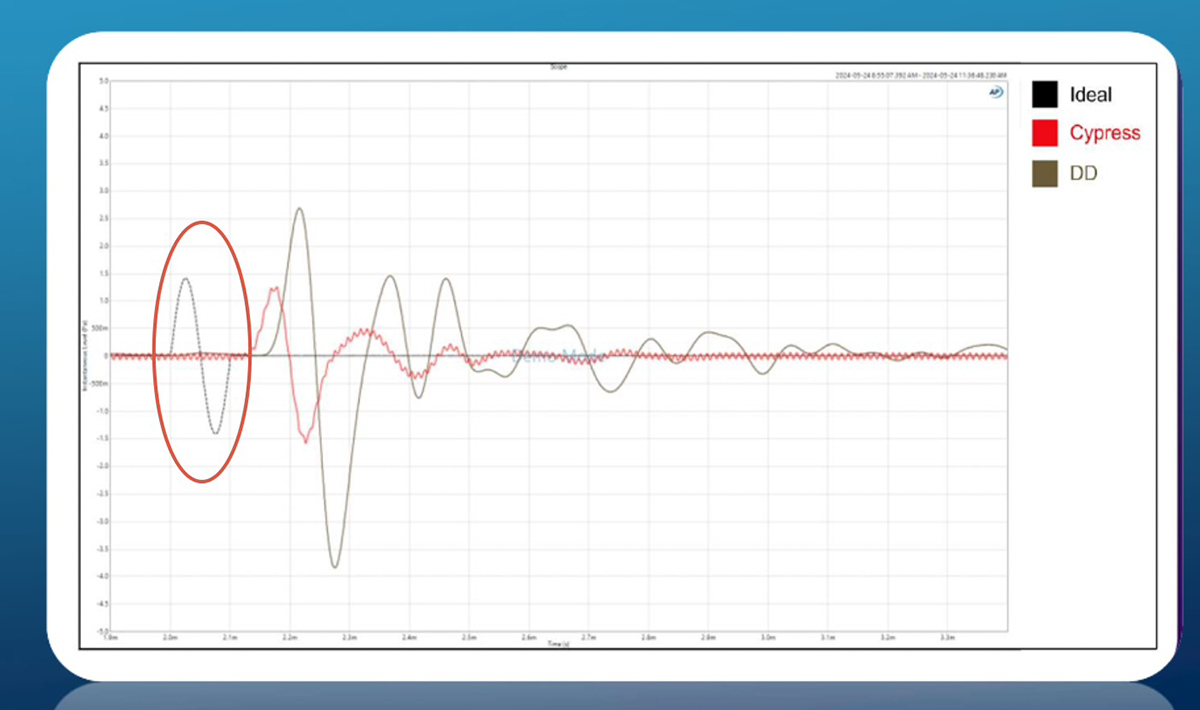 次に「図3B Cypress時間応答」を見て分かるのは、極めて入力波形に正確なことだ。図の左側の赤丸部分が入力波形だが、続く黒いダイナミックドライバーの出力波形は入力波形に対してオーバーシュート(行きすぎ)するとともに、振動がなかなか収束しない。それに比べて赤いCypressドライバーの波形は入力波形と極めて近似していて、振動もすぐに収束する。それだけ入力に正しい音が得られるわけだ。
