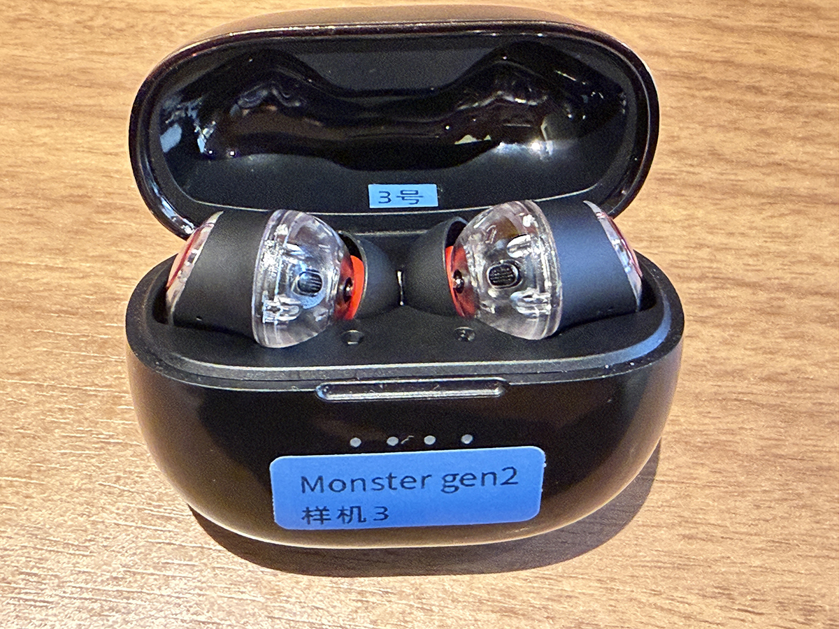 次に実際に開発中の「Cypress」ユニットを搭載したデモ用のTWSを見せてもらうことができた。これは「Monster Gen2」と呼ばれるもので、Raykingで開発中のユニットだ。内部にはフルレンジで、大きさは通常のTWSと同じである。