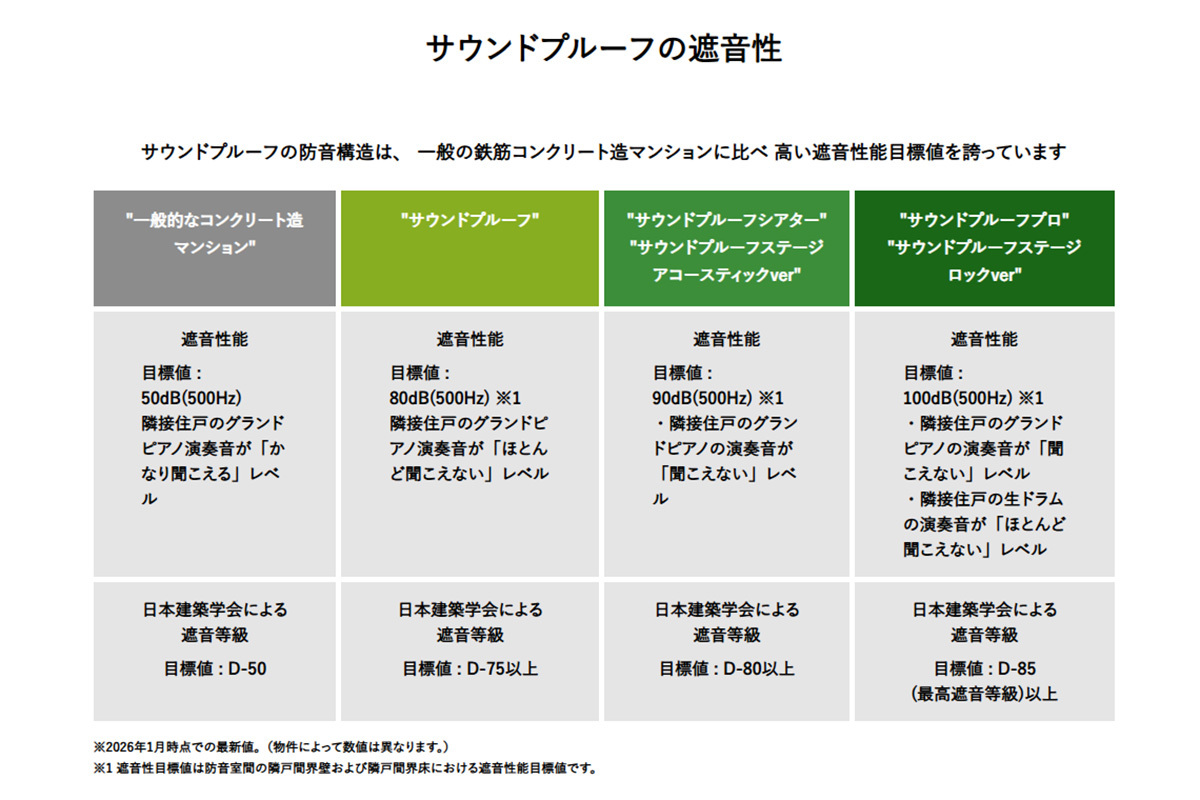 サウンドプルーフシリーズは全23棟(2026年4月現在)を構える。共通して高い遮音性・防振性を得られる多重防音構造、コンクリート躯体の中にそれぞれ独立した住戸を浮き構造で造る「ボックスインボックス構法」を採用する。