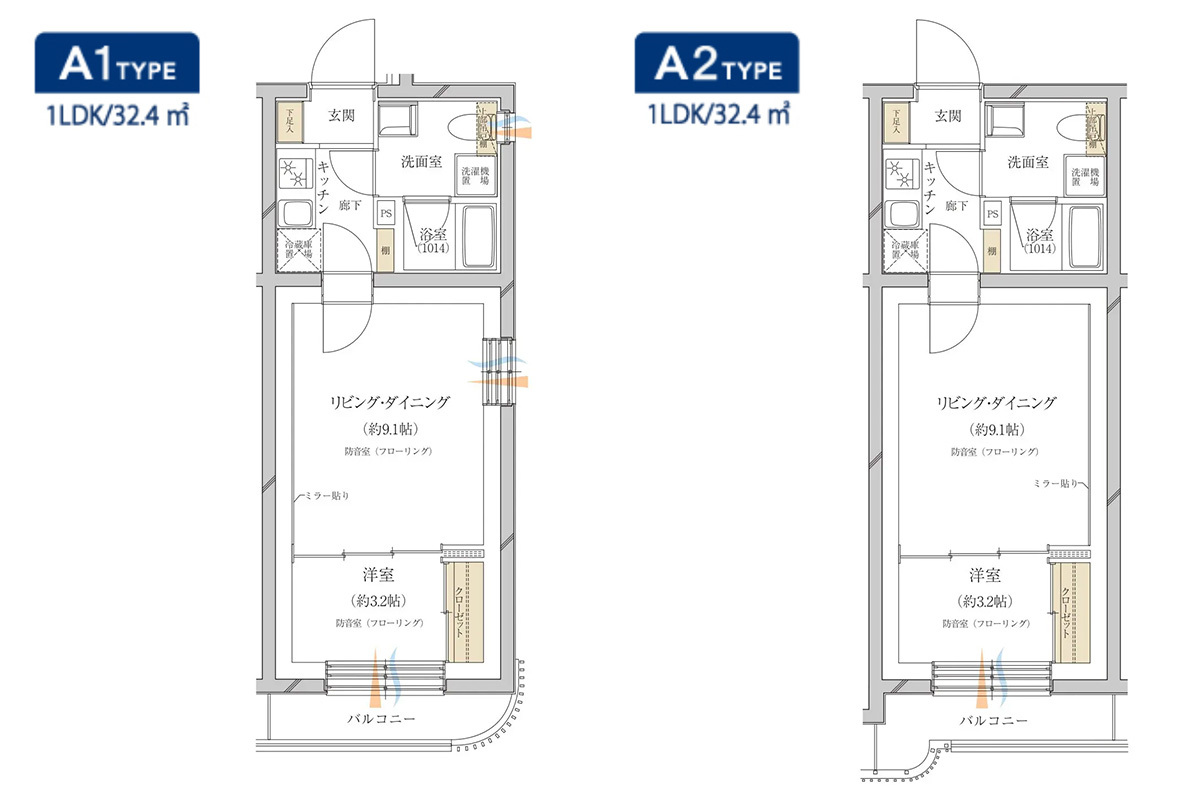 モデルルームは隣り合う101号室と102号室で、もっともコンパクトなAタイプ、1LDK/32.4平米の間取り。Aタイプの防音室は、約9.1畳のリビングダイニングと約3.2畳の洋室からなる。リビングダイニングに、101号室はドラムセット、102号室はホームシアターがそれぞれセッティングされている。