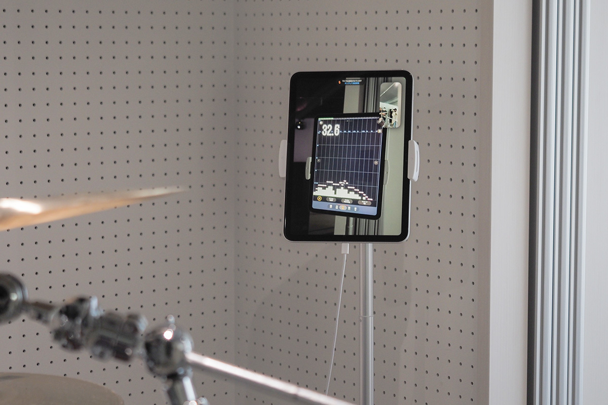 次に101号室でドラムの演奏も試してみる。今回は周囲の音圧レベル(dBA SPL)を正確に計測できるアプリ「デシベル X」を用いて、隣室の102号室でドラムの音が聞こえるか計測し、数値的な検証を行った。