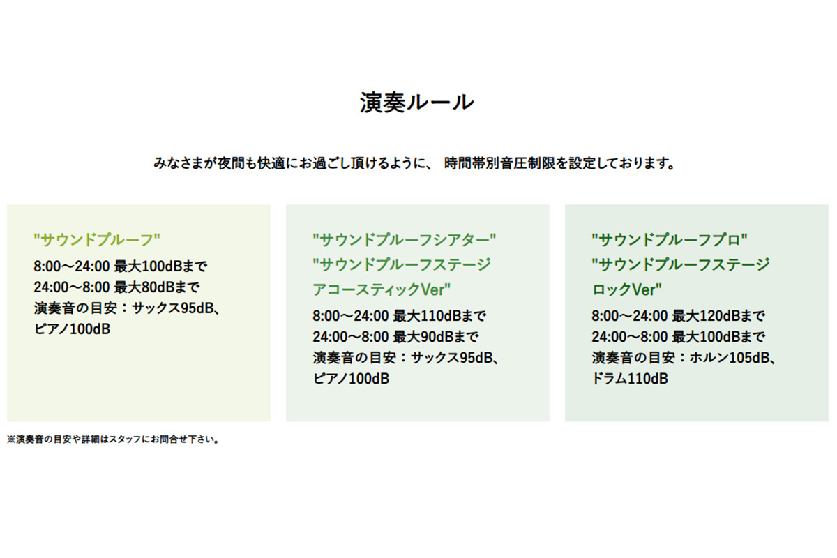 それもそのはず、サウンドプルーフステージにおける遮音性能は100dB(500Hz)、D-85等級相当を目標値としている。これは隣接住戸のグランドピアノの演奏音が「聞こえない」、生ドラムの演奏音が「ほとんど聞こえない」レベル。夜間は音圧制限を設けており、内外の音漏れを意識せず日常生活をおくることができるのである。
