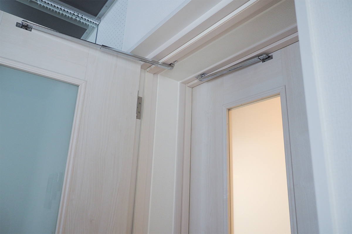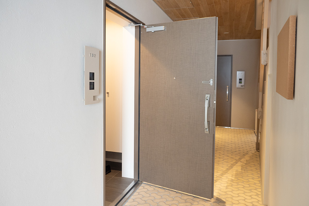 リビングダイニングとキッチンを隔てるのは、空気層を設けた二重ドア。扉を閉めるとパッキング機構が動作して気密性を高める仕組みとなっている。玄関もエアタイトドア仕様で、共用廊下への音漏れを防ぐ。