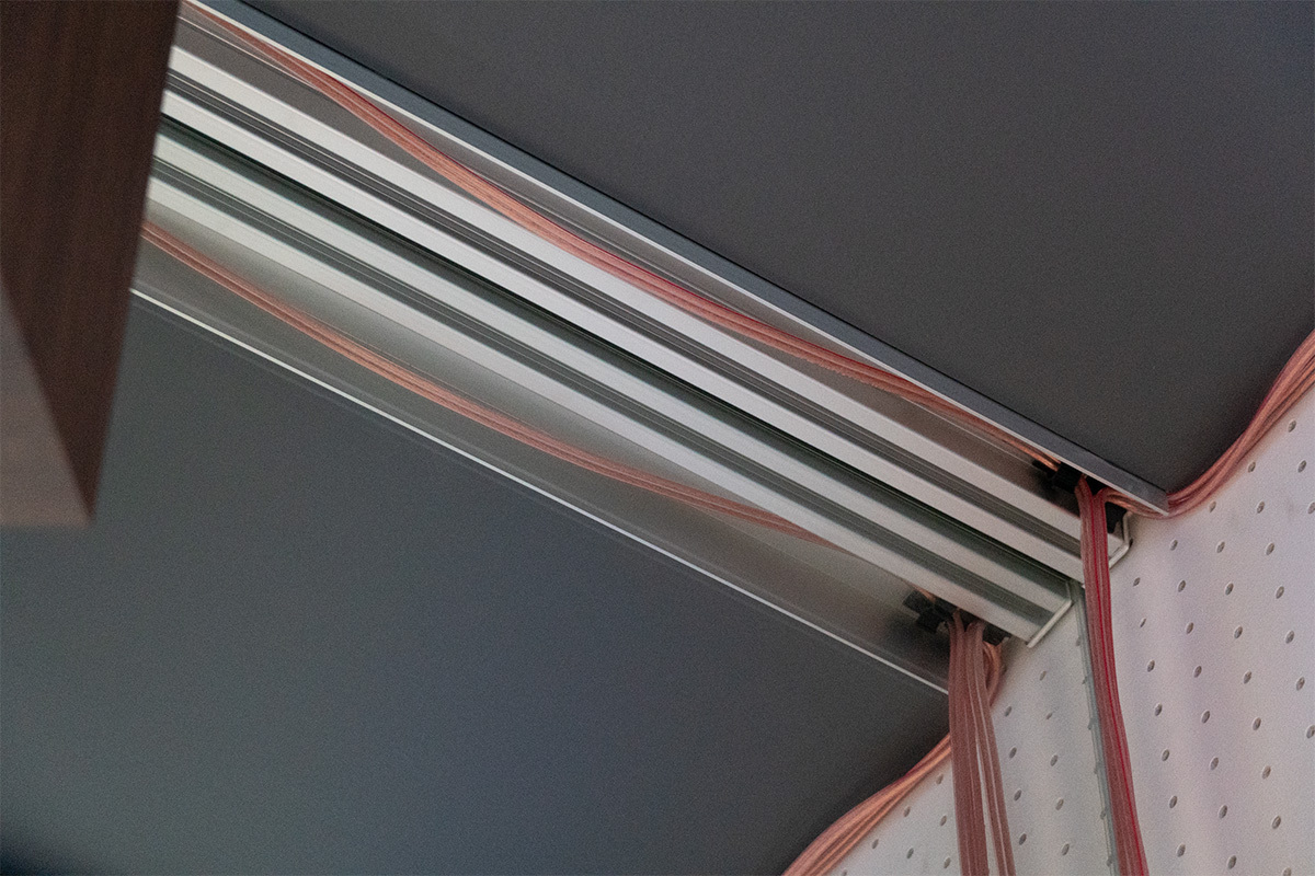 ほかリビングダイニングには、DTM制作、レコーディングなどに向けて、200Vの壁コンセント1系統を装備。部屋の角をつなぐようにガイドレールが入っており、天井や壁を伝って配線が可能。賃貸でも、モール不使用でケーブル類を隠蔽できる。