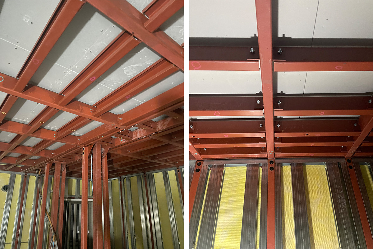 防音マンションは各住戸を上から吊り、床と壁のみを絶縁する構造が一般的だが、サウンドプルーフ ステージの防音室はドア部分も含め、天井、壁、床のすべてにおいて躯体から絶縁されている。これによって共振を防ぎ、非常に高い防振性、ひいては遮音性も確保している。