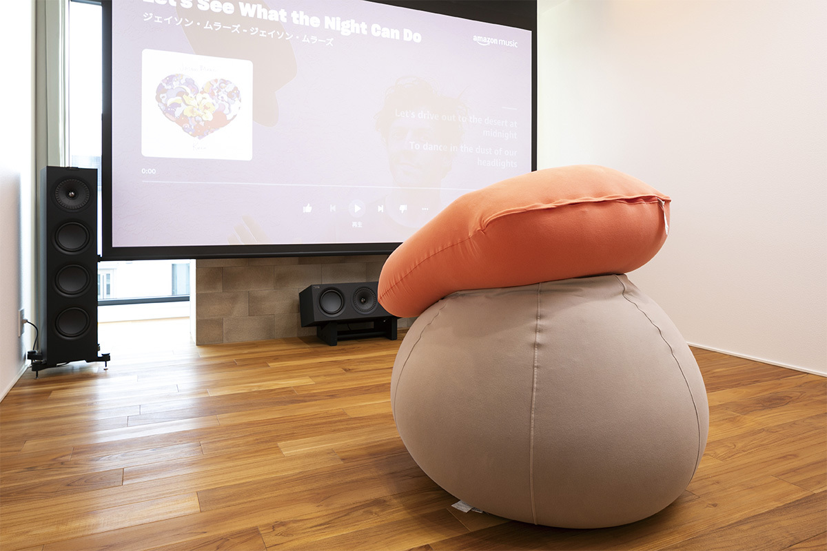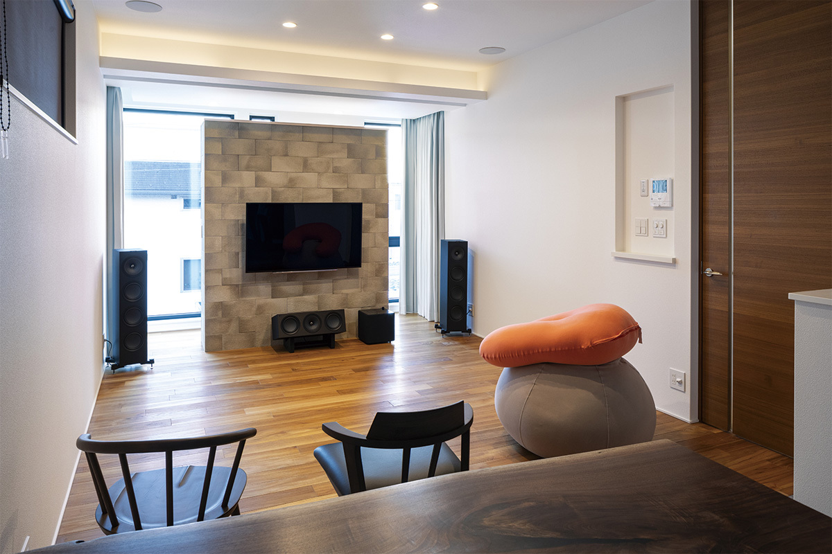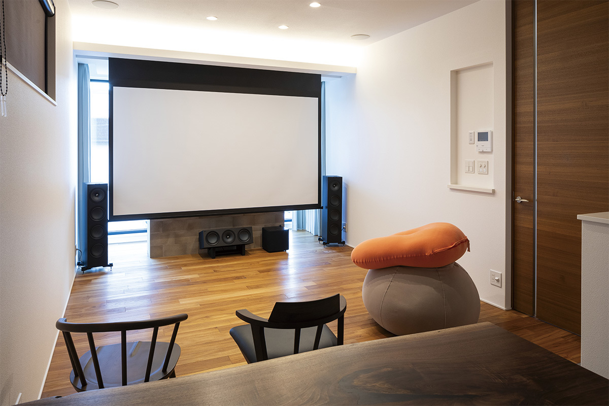こうして美しく生活空間に溶け込んだI邸のリビングシアターは、稼働率がとても高いという。ご主人が音楽を聴きながら過ごすこともあれば、奥様がヨガのレッスンに大画面を利用されることも、ご家族でNintendo Switchでゲームをされることもあるのだとか。また、環境音をかけて「何もしない時間」を設けることも、とても心地いいのだという。
