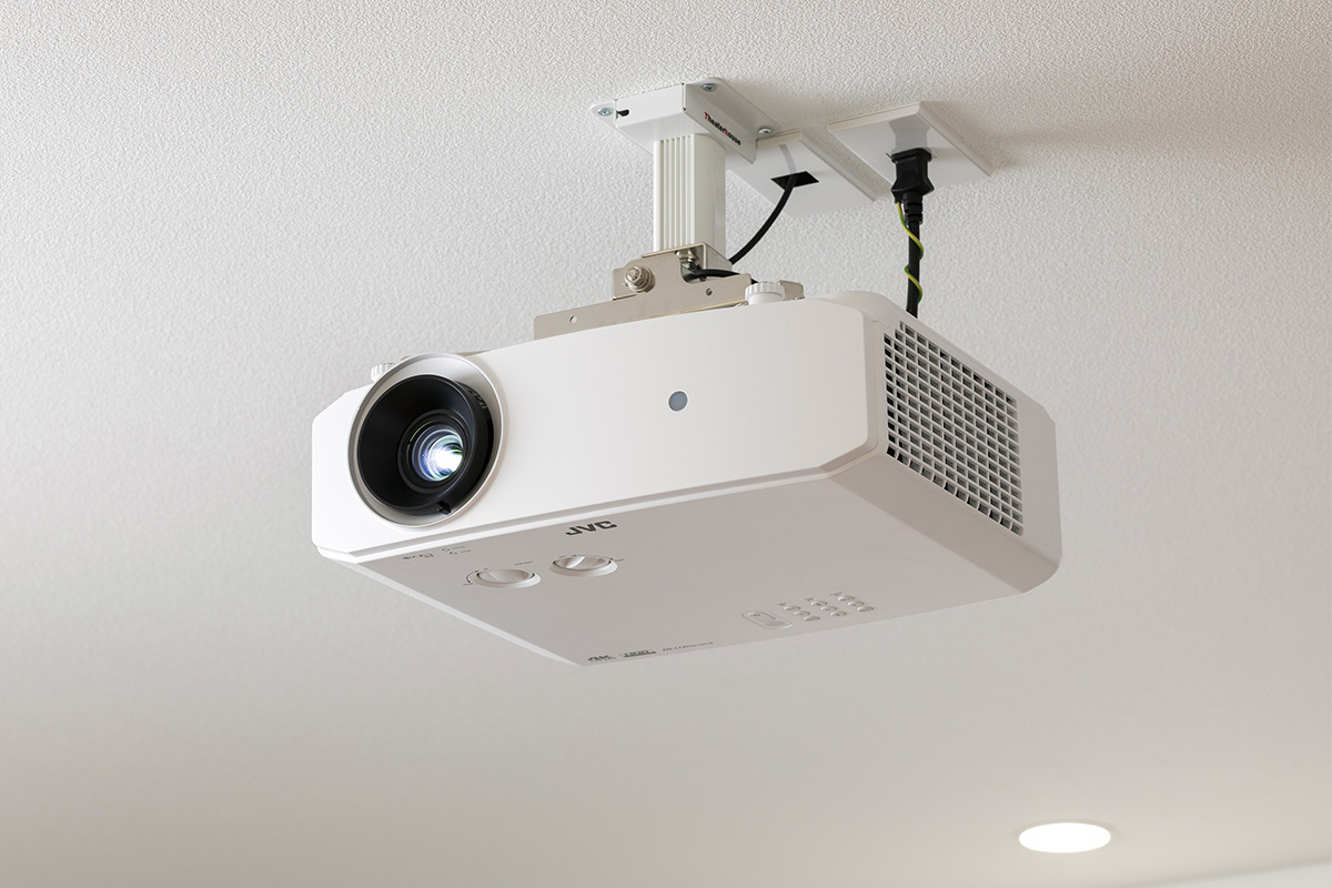 スクリーンも普段は存在を感じさせないようにビルトイン。プロジェクターは天吊り設置している。インテリアに対してディスプレイがジャストサイズで、フロントのスピーカーのレイアウトが左右均等。インストーラーの緻密なプランが窺える、計算が行き届いた空間になっている。