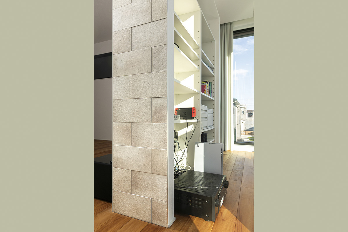 リビングに収納用の「壁」を造作、機器を隠蔽した広々2Wayシアター