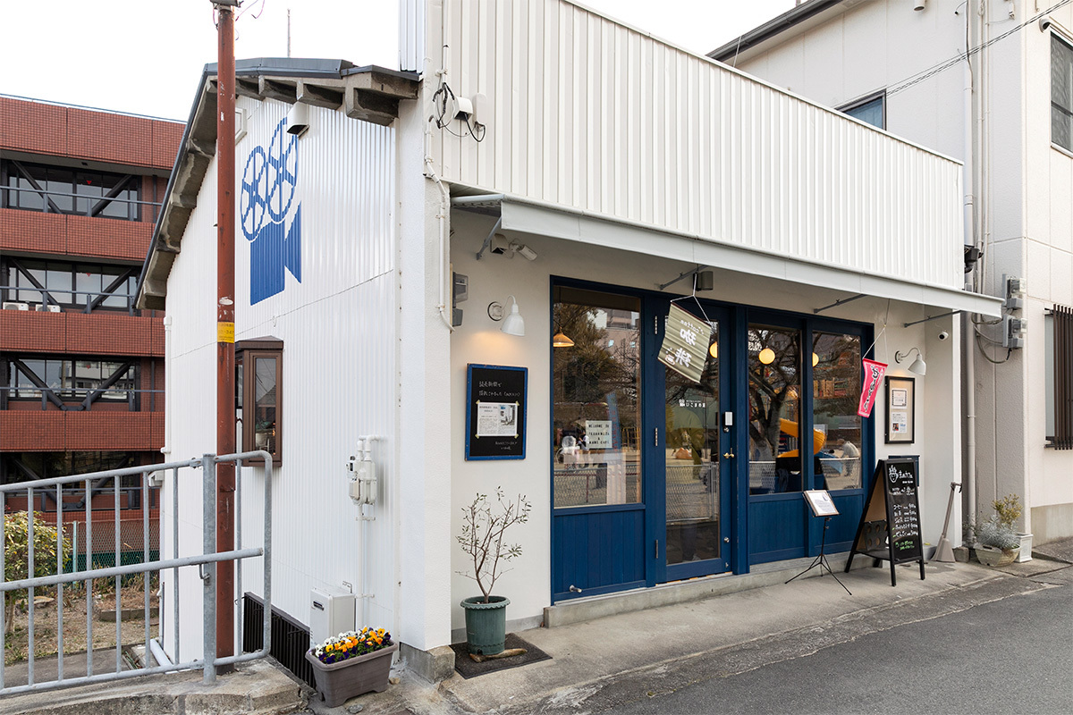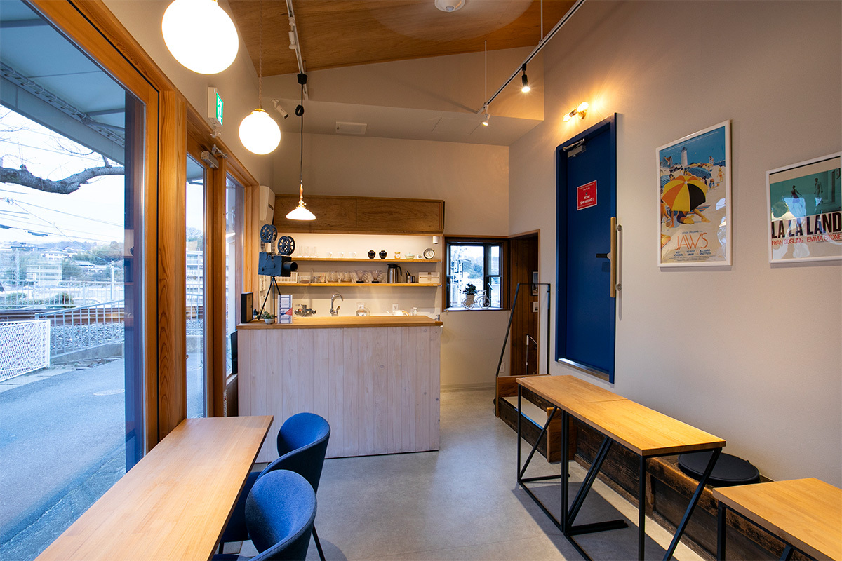 奈良県生駒市、近鉄生駒駅から徒歩7分。「珈琲」や「ぜんざい」の暖簾が揺れる小さなカフェの外壁に、ムービーカメラを模したマークがあしらわれている。店内に本格的なシアタールームを備える「MYプライベートシアター いこまめ座」の目印だ。