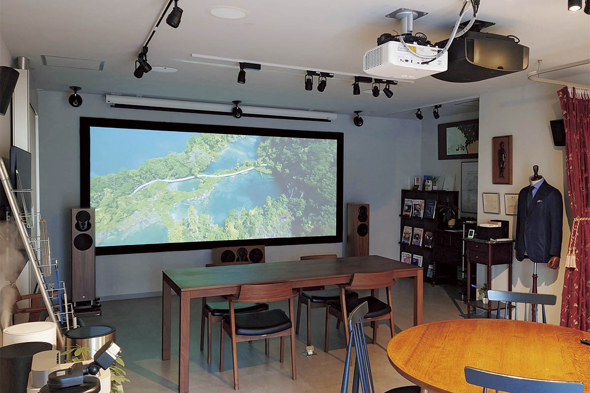 ディスプレイはサウンドスクリーン。曾根氏は、間取り決定前という早期相談の利点を活かして約14畳の専用室を設け、150型を実現した。またスピーカースペースは、映像と音の出所がよりリンクするよう床面を調整。こうして、画面の真ん中から音やセリフが聞こえるという映画館と同じ体験が可能になった。