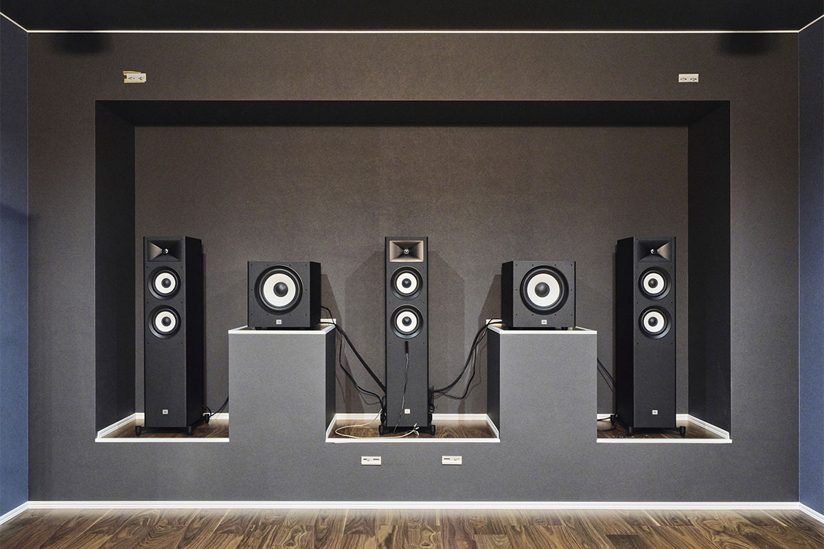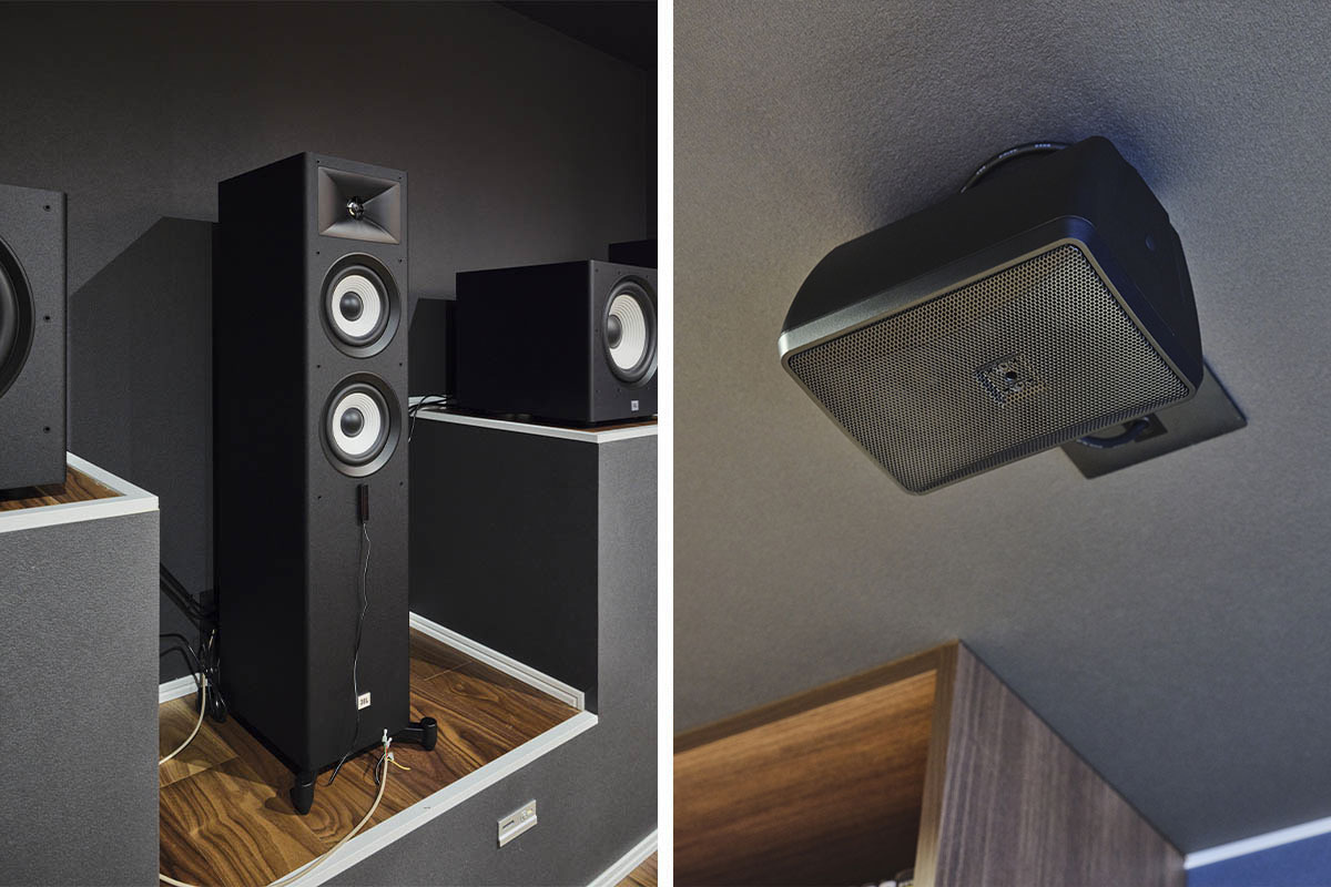 サラウンドも本格派。Kさんが好きなDolby Cinemaのサウンド体験を再現すべく、7.2.6chのイマーシブシステムを導入。映画館でも採用率の高いJBLスピーカーで統一しつつ、空間を最大限活用できるチャンネル数を算出した。