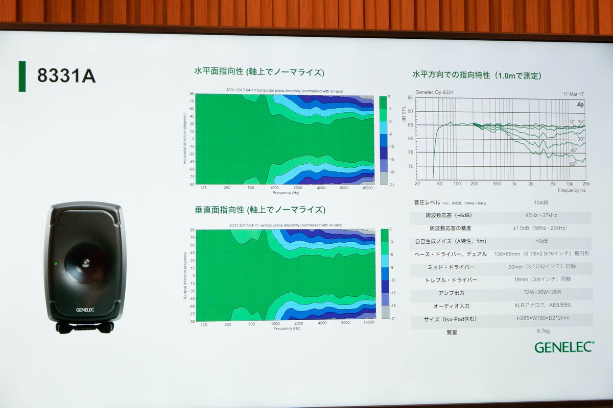 再生周波数特性38Hz - 37 kHzであり、高域特性は8331Aと同じだが、低域は7kHzほど深くでてくるので、さらにワイドレンジ。音圧は110 dBで、至近距離にとどまらず大音量が鳴らせる環境でも使えそうだ。