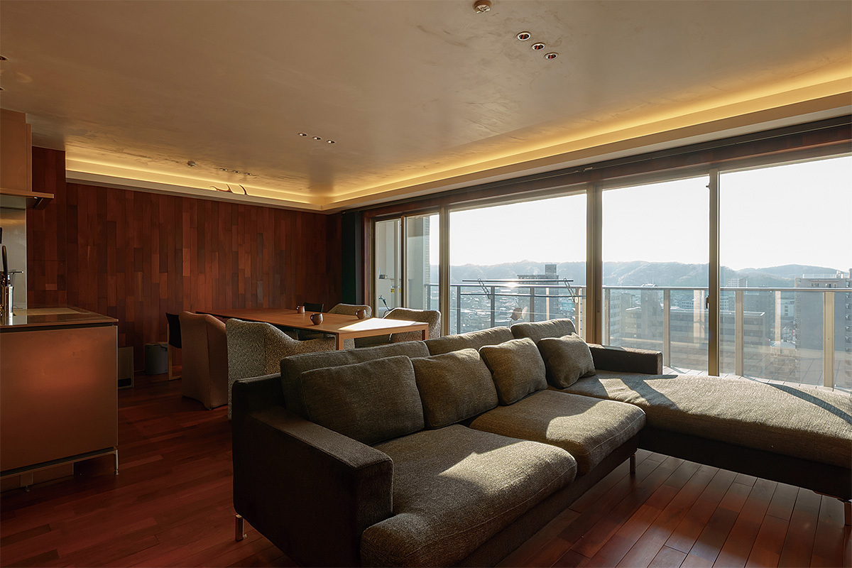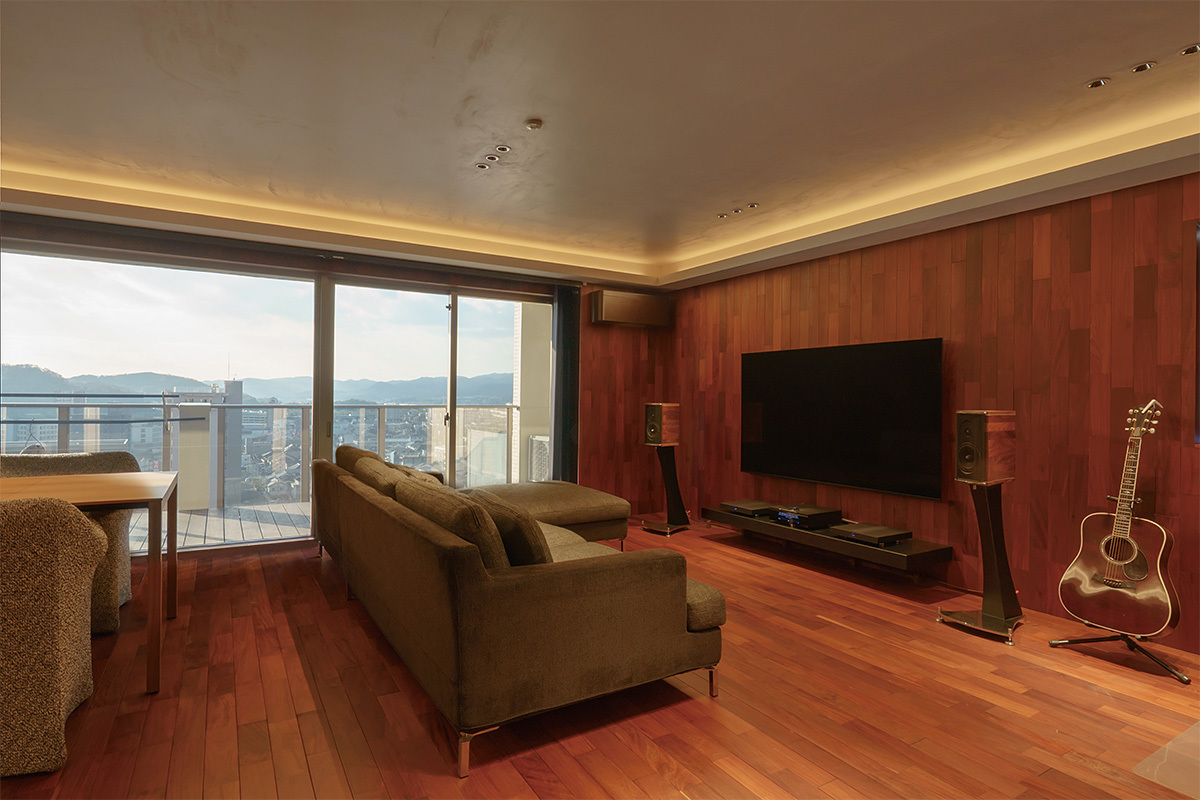 HOME THEATER DATA ●住宅形態:マンション/リフォーム ●ホームシアターの広さ:約28畳(LDK)+約9畳(寝室)●画面サイズ:77型(LDK)+100型(寝室)●サラウンド:2.0ch(LDK)、4.1ch(寝室)●インストール内容:機器設置、システムプランニングほか